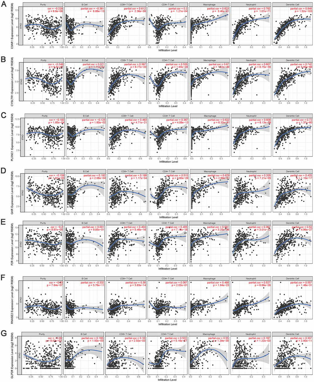 To validate the relationships between IRGs and TIICs, TIMER was used to visualize the correlations between the expression of hub IRGs and the infiltrating levels of B cells, CD8+ T cells, CD4+ T cells, macrophages, neutrophils and DCs in the TME. The results showed that most of the hub IRGs were significantly associated with the abundances of TIICs, especially C3AR1, CYSLTR1, PLXNC1, GHR, F2R, RNASE2 and GLP2R, which are shown in Figure 14.