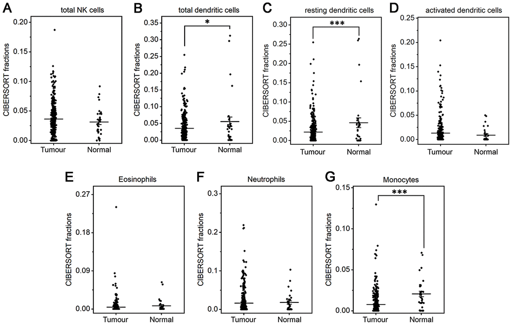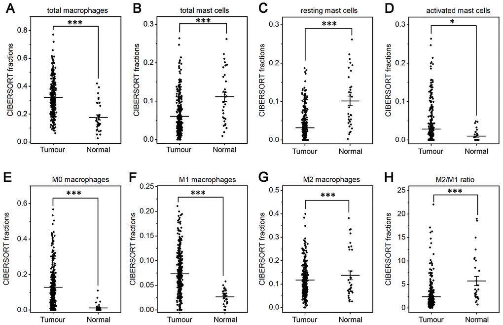 The fractions of total DCs, resting DCs and monocytes were lower in gastric cancer than in normal tissue (P<0.05 or P<0.001, Figure 3B, 3C, 3G). The fractions of total and resting mast cells were strongly decreased in gastric cancer compared to normal tissue(P<0.001, Figure 4B, 4C), whereas the activated mast cell fraction increased slightly (P<0.05, Figure 4D). The total macrophage fraction increased significantly in gastric cancer compared with normal tissue (P<0.001, Figure 4A), which contributed to the incremental increases in the M0 and M1 macrophage fractions (P<0.001, Figure 4E, 4F). The M2 fraction decreased in cancer tissue (P<0.001, Figure 4G). Correspondingly, the ratio of M2/M1 was lower in gastric cancer than that in normal tissue (Figure 4H). In addition, resting NK cells, activated NK cells, activated DCs, eosinophils and neutrophils did not differ between tumor and normal tissues.