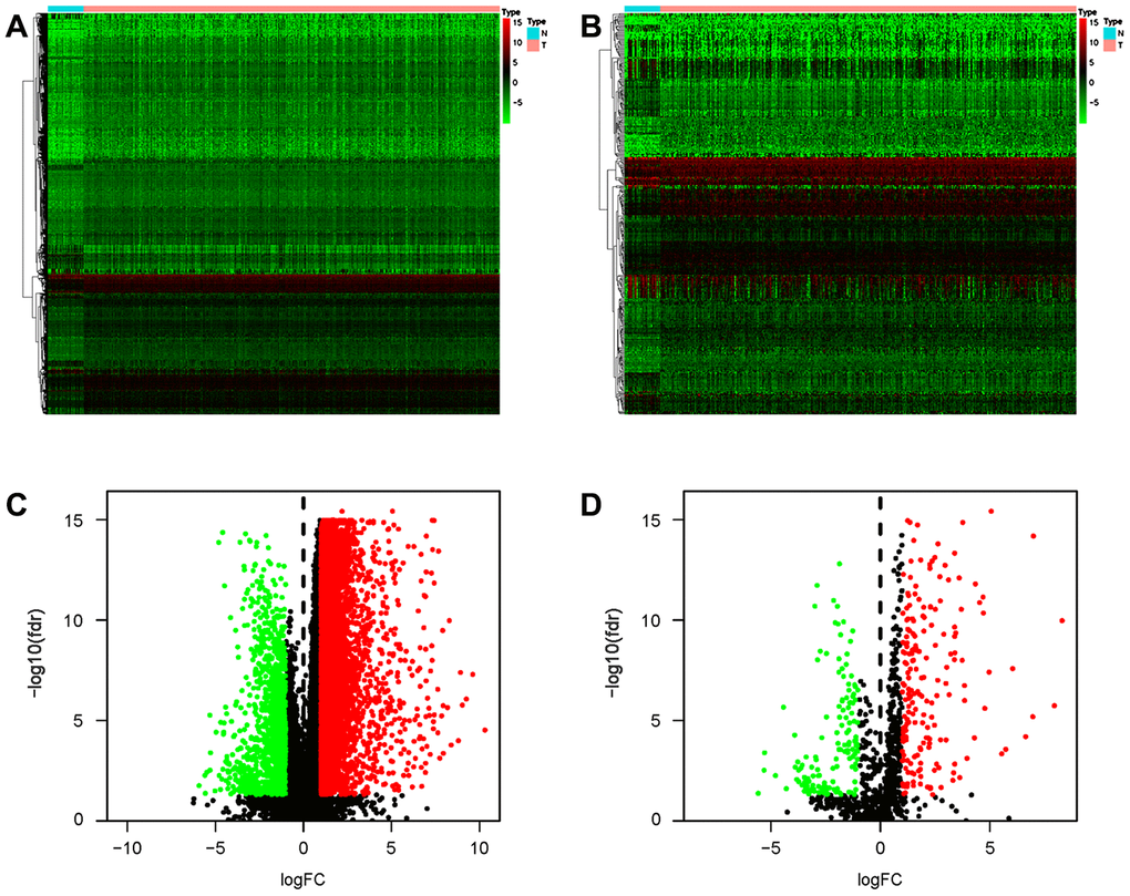 As IRGs can reflect the immune status of cancer patients, we extracted IRGs with differential expression in gastric cancer patients from transcriptomic RNA-seq data for further analyses. First, Wilcoxon signed-rank test was applied to identify differentially expressed genes (DEGs) between gastric cancer and normal tissue. The results showed that a total of 6749 DEGs were screened, including 5601 upregulated and 1148 downregulated genes (Figure 6A, 6C). Among these DEGs, we further identified 345 differentially expressed IRGs, including 198 upregulated and 147 downregulated IRGs (Figure 6B, 6D).