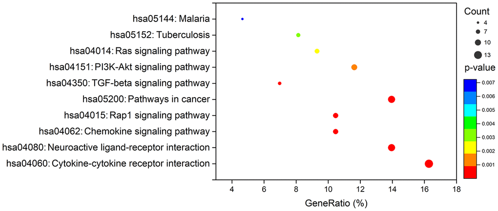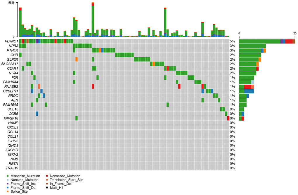 To create a valuable prognostic signature, univariate Cox analysis was conducted to screen IRGs associated with the OS of gastric cancer patients. In total, 100 genes were found to be significantly associated with clinical outcomes (P<0.05). Then, Gene Ontology (GO) enrichment analysis of these survival-associated IRGs showed that “positive regulation of ERK1 and ERK2 cascade”, “positive regulation of cytosolic calcium ion concentration” and the “inflammatory response” were the three most significant biological process terms; the “extracellular region”, the “extracellular space” and “integral component of plasma membrane” were the three most significant cellular component terms; and “growth factor binding”, “growth factor activity”, and “peptide hormone binding” were the three most significant molecular function terms (Table 1). Cytokine-cytokine receptor interaction was found to be the most frequently enriched Kyoto Encyclopedia of Genes and Genomes (KEGG) pathway (Figure 7). Furthermore, 29 hub IRGs were ascertained to be differentially expressed in gastric cancer and closely related to the OS (Figure 8A). A forest plot of hazard ratios indicated that most of these hub IRGs were high-risk factors (Figure 8B). Owing to the potential prognostic significance of these hub IRGs, their molecular characteristics related to genomic alterations were further analyzed. The results showed that these hub IRGs were unstable in gastric cancer and missense mutations were the most commonly occurring type (Figure 9).