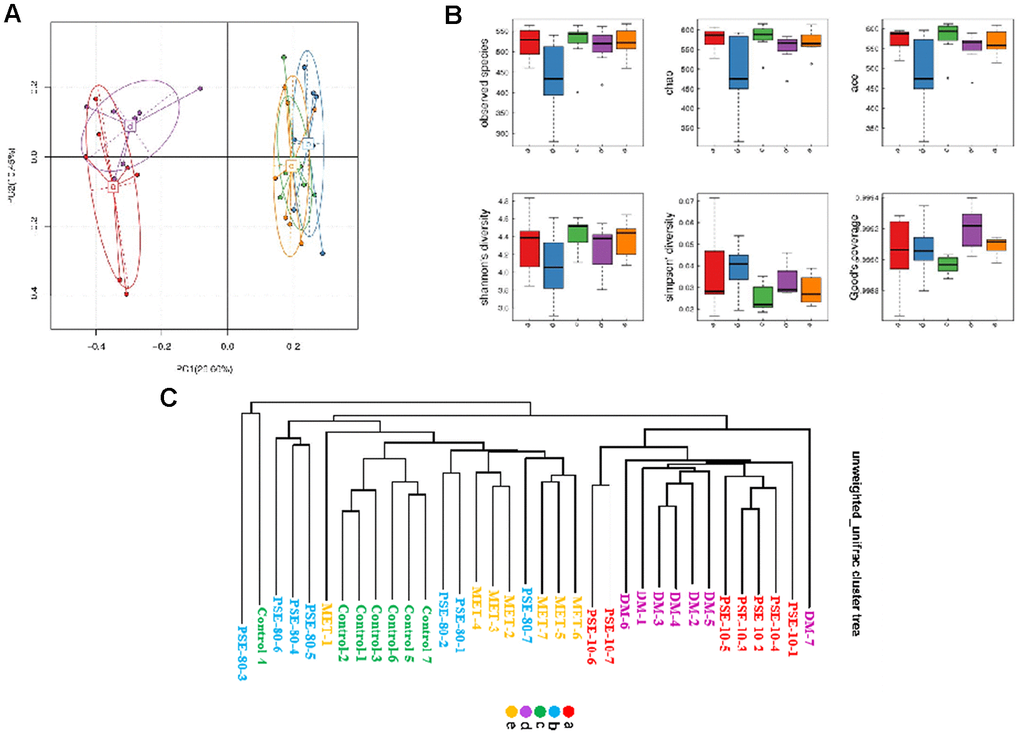 The results of the PCA analysis based on OTU abundance and intergroup alpha diversity box map are given in Figures 3A and 3B. Letters a, b, c, d, and e in the graph represent the 10 mg/kg PSE-treated, 80 mg/kg PSE-treated, normal control, DM, and 140 mg/kg MET-treated groups, respectively. The results showed that the normal control and DM groups could be distinguished clearly on the basis of the gut microbiota composition. Similar to MET, 80 mg/kg PSE significantly affected the gut microbiota composition of the mice with T2DM (Figure 3A). The results of the multivariate ANOVA of the PCoA matrix scores indicated a statistically significant separation between the microbiota of the control group and the DM group. Significant separations were also observed in the DM, MET, and 80 mg/kg PSE groups (Figure 3C). However, the gut microbiota of the mice in the 10 mg/kg PSE-treated group did not significantly differ from that of the mice with diabetes (Figure 3C). This outcome was consistent with the weak effects observed in the mice treated with 10 mg/kg PSE (Figures 1 and 2). These results suggested that PSE significantly regulated the intestinal microflora.
