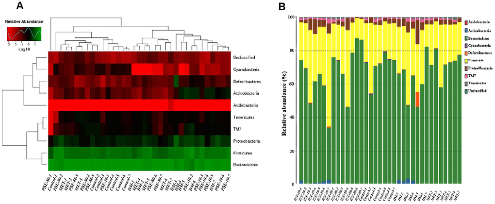 Thirteen classes, namely, 4C0d-2, Actinobacteria, Bacilli, Bacteroidia, Betaproteobacteria, Clostridia, Deferribacteres, Deltaproteobacteria, Epsilonproteo-bacteria, Erysipelotrichi, Gammaproteobacteria, Mollicutes, and TM7-3, were investigated (Supplementary Figures 2A and 2B). The abundance of Actinobacteria, Betaproteobacteria, Deltaproteo-bacteria, Erysipelotrichi, and Deferribacteres of the DM group significantly increased compared with that of the control group (p < 0.0001, p < 0.01, p < 0.01, p < 0.01, and p < 0.01, respectively). By contrast, the abundance of Bacilli, Bacteroidia, Chloroplast, Gammaproteobacteria, and 4C0d-2 decreased (p < 0.001, p < 0.05, p < 0.001, p < 0.01, and p < 0.01, respectively). These effects were reversed by treating the mice with 80 mg/kg PSE and 140 mg/kg MET. However, 10 mg/kg PSE-treated group did not have this effect.