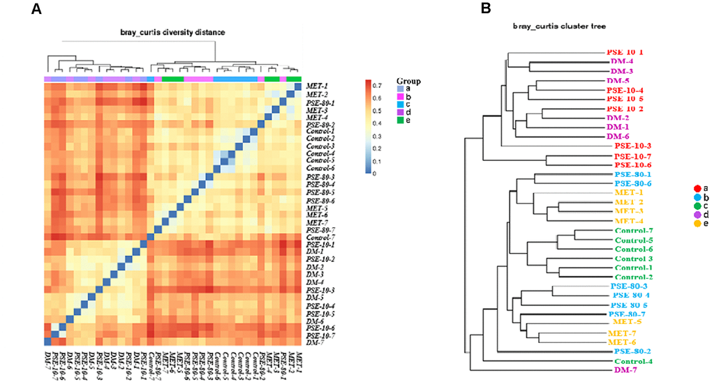 The Bray Curtis heatmap of the results of the beta diversity and cluster analysis of the species composition is shown in Figures 5A and 5B. The similarity of microbial flora among the control group, 80 mg/kg PSE treatment group, and MET treatment group was very high. The gut microflora in the DM and 10 mg/kg PSE-treated groups were similar. Cluster analysis revealed that the microbiota of 80 mg/kg PSE-treated, control, and 140 mg/kg MET-treated groups significantly differed from those of 10 mg/kg PSE-treated and DM groups. These results implied that the imbalance of gut microbiota was associated with T2DM. Therefore, 80 mg/kg PSE and 140 mg/kg MET might significantly affect intestinal microorganisms. However, 10 mg/kg PSE was inefficient.
