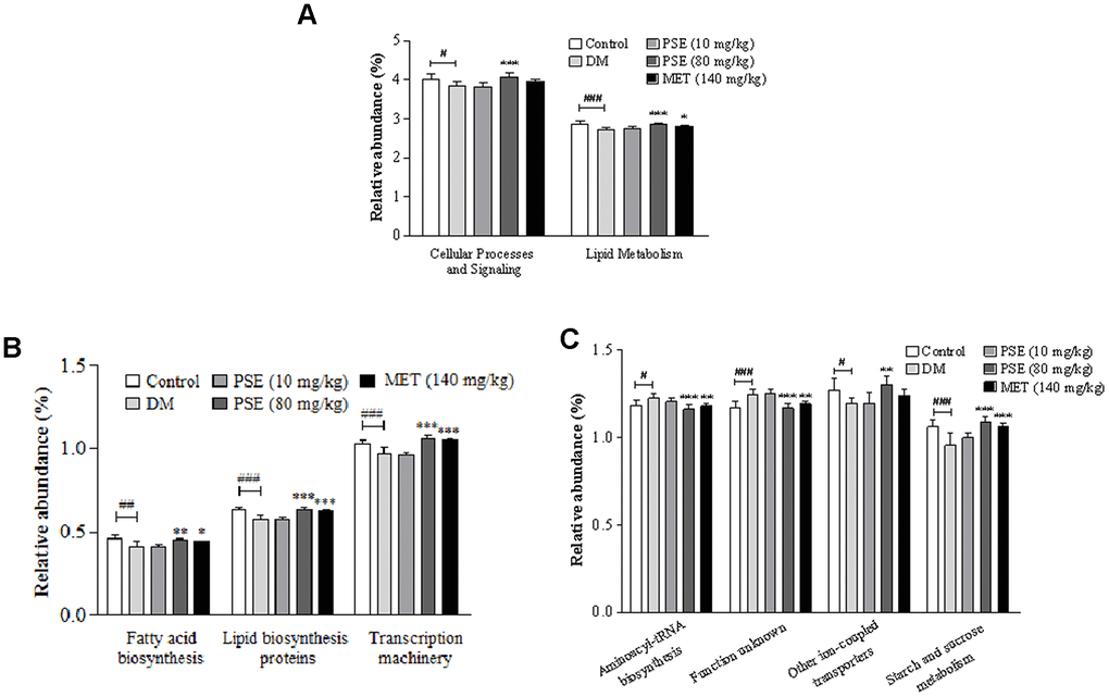 PICRUST was applied to determine the 16S RNA sequence and predict the abundance of gut microbiota at levels 2 and 3 of the KEGG pathway. The results of PICRUST function analysis of the gut microbiota of the mice with T2DM are shown in Figure 7, Supplementary Figures 7 and 8. The abundance of the gut microbiota in cellular process signaling and lipid metabolism at level 2 of the KEGG pathway of the DM group significantly decreased compared with that of the normal control group (Figure 7A; p < 0.05 and p < 0.01, respectively). After the treatment with 80 mg/kg PSE, the abundance of cellular process signaling and lipid metabolism of the diabetic model mice significantly increased compared with that of the DM group (Figure 7A; both with p < 0.001). Furthermore, the abundance of the gut microbiota in fatty acid biosynthesis, lipid biosynthesis, proteins, transcription machinery, other ion-coupled transporters, and starch and sucrose metabolism at level 3 of the KEGG pathway in the DM group significantly decreased (Figures 7B and 7C; p < 0.001, p < 0.01, p < 0.01, p < 0.05, and p < 0.001, respectively). The abundance of the gut microflora in aminoacyl-tRNA biosynthesis and an unknown function at the same level in the DM group increased (Figures 7B and 7C; p < 0.05 and p < 0.001, respectively). All these parameters or factors in the mice with T2DM recovered or mostly recovered to normal levels after they were treated with 80 mg/kg PSE and MET at the indicated dose. These results suggested that the gut microorganisms involved in lipid, sugar, and protein metabolism were affected by PSE and MET treatments that caused antidiabetic effects.