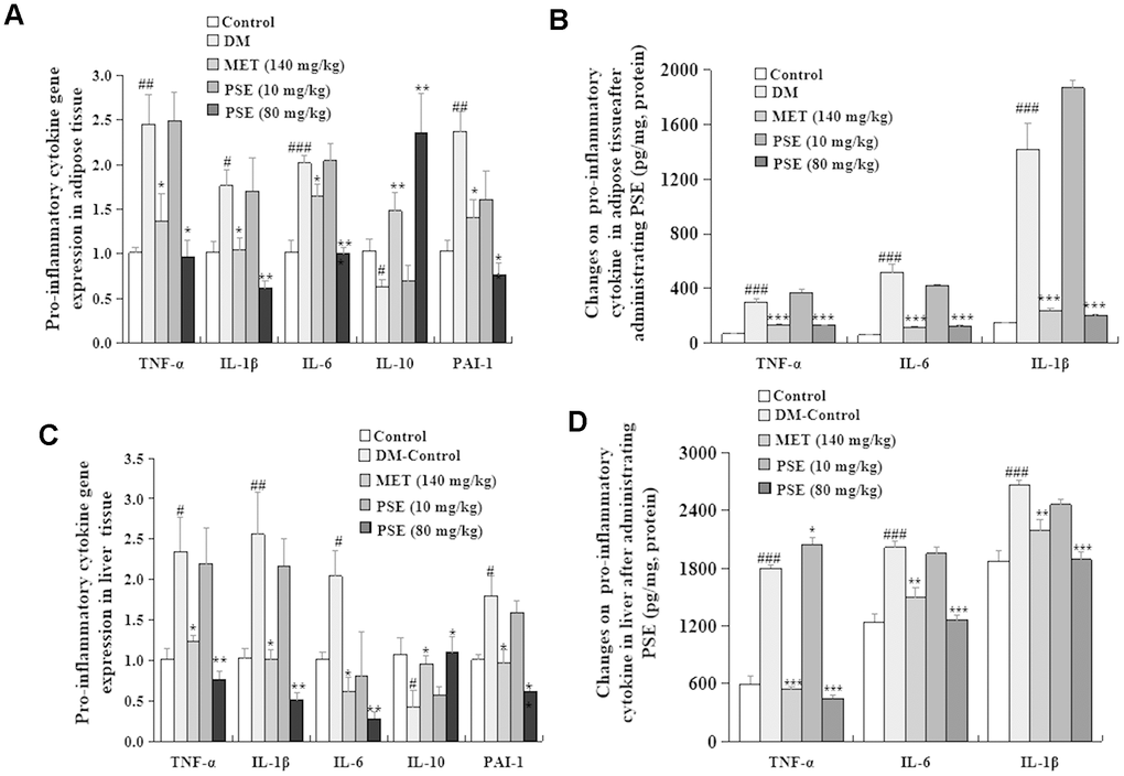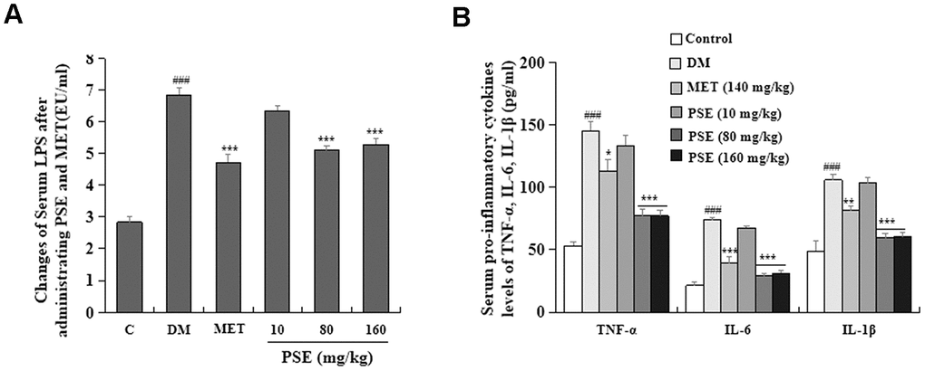 Inflammation is one of the important factors that induce T2DM [7–9]. As such, this factor was investigated in our study. The changes in LPS and pro-inflammatory cytokines in the blood of experimental mice are displayed in Figure 8. The LPS (Figure 8A) and pro-inflammatory cytokines (Figure 8B) of DM significantly increased after the long-term feeding of HFD. Simultaneously, the LPS of the mice with T2DM obviously decreased after they were treated with 80 and 160 mg/kg PSE (Figure 8A; both with p < 0.001). However, 10 mg/kg PSE did not significantly affect the LPS in the blood of the mice with T2DM (Figure 8A). Pro-inflammatory cytokines, such as TNF-α, IL-6, and IL-1α, did not significantly change in the mice treated with 10 mg/kg PSE. However, they significantly decreased after the treatment with 80 mg/kg and 160 mg/kg PSE and with the indicated dose of MET (p < 0.001, p < 0.001, p < 0.001, p < 0.05, p < 0.001, and p < 0.01, respectively). These results indicated that PSE and MET could significantly prevent the increase in LPS and pro-inflammatory cytokines in the blood of the mice with T2DM induced by HFD. However, low-dose PSE (10 mg/kg) was not effective against these factors.