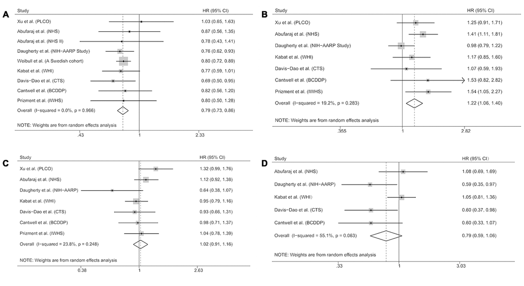 Figure 1 shows risk estimates of the association between bladder cancer and reproductive and hormonal factors in the meta-analysis. We can see that parous women had significantly lower bladder cancer risk than nulliparous women (pooled HR 0.79, 95% CI 0.73-0.86; Figure 1A). No significant heterogeneity was observed between the study-specific HRs overall (p for heterogeneity = 0.966). In addition, we observed a significant association between menopause at an earlier age and bladder cancer risk (pooled HR 1.22, 95% CI 1.06-1.40; Figure 1B) without obvious heterogeneity between studies (p for heterogeneity = 0.283). No significant association was found for any use of hormone replacement therapy (HRT) (pooled HR 1.02, 95% CI 0.91-1.16; Figure 1C). However, women who used estrogen-progestogen therapy (EPT) for HRT experienced a no significantly lower risk than those who never used HRT (pooled HR 0.79, 95% CI 0.59-1.06; Figure 1D).