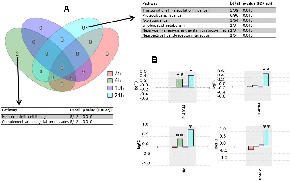The differentially expressed proteins at the time point that revealed the most pronounced changes (24 h post-infection), were subjected to network analysis using iPathwayGuide. The interactions included were activation, binding, catalysis, expression, and inhibition. Confidence score for protein-protein interaction was set at 900 (high). The resulting network is shown in Figure 2A. One of the subnetworks with the highest number of interactions, comprised of six proteins, is shown in Figure 2B, together with the expression change profile over post-infection time for these six proteins.