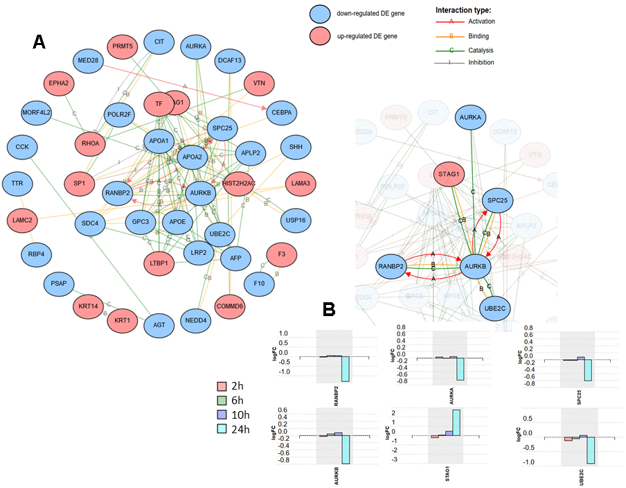 Figure 2A shows the network formed by the DE proteins, excluding isolated nodes. One of the subnetworks with a higher number of connections is the one formed by RANBP2 (E3 SUMO-protein ligase RanBP2) (Figure 2B). RANBP2 forms a complex at the nuclear pore with TRIM5α, a cytoplasmic restriction factor that blocks post-entry retroviral infection and is regulated by SUMO. It has been demonstrated that loss of RANBP2 blocked SUMOylation of TRIM5α, suppressing its anti-retroviral activity [20]. Here, RANBP2 exhibited a statistically significant fold-change (log) of -1.295 at 24 h post-infection, thus the role of RAMBP2-TRIM5α in coronavirus infection deserves further consideration. In the same subnetwork as RANBP2, four other proteins that are interestingly related to cell cycle progression, AURKA, AURKB, SPC25 and STAG1, also deserve further attention (Figure 2B). They all participate in the regulation of chromosome segregation during mitosis [21–24]. Three of these four proteins were found to be down-regulated at 24 h post-infection except STAG1, which was strongly up-regulated. In this subnetwork, closely related to AURKB, and also down-regulated, is UBE2C (Ubiquitin-conjugating enzyme E2 C), which is an essential factor of the anaphase promoting complex/cyclosome (APC/C), a cell cycle-regulated ubiquitin ligase that controls progression through mitosis [25].