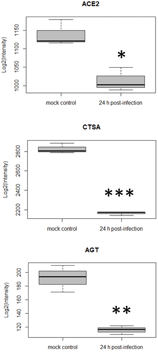 In parallel to re-analyzing the data with alternative tools, we also noticed a trend towards down-regulation of ACE2 over time post-infection (Figure 3). This had not been highlighted by the original authors [10]. In fact, at 24 h post-infection ACE2 presented a fold-change in expression (log) of -0.168 (p-value = 0.01). Coronavirus entry into target cells depends on binding of its spike (S) proteins to a cellular receptor, which facilitates viral attachment to the surface of target cells. ACE2 was reported as the entry receptor for SARS-CoV [26], another coronavirus closely related to SARS-CoV-2, therefore playing a key role in SARS-CoV transmissibility [27]. Similar findings were recently made for ACE2 and SARS-CoV-2 [7]. ACE2 is also a peptidase in the renin-angiotensin system, that converts angiotensin I to angiotensin (1-9) and angiotensin II to angiotensin (1-7), which is a vasodilator. ACE2’s protective role in lung injury is therefore related to its ability to cleave angiotensin II [28, 29]. It was also reported that ACE2 expression protects from lung injury and is downregulated by SARS-CoV [8, 9], which might promote lung injury, therefore worsening the prognosis of the disease. Here, we highlight that SARS-CoV2 also seems to interfere with ACE2 expression, and this may be related to a higher level of lung injury as was demonstrated for SARS-CoV. When inspecting the quantitative data for other proteins in the renin-angiotensin system, two other proteins were found to be down-regulated 24 h post-infection, namely cathepsin A (CTSA) and angiotensinogen (AGT) (Figure 3). We hypothesize that dysregulation of some of the key components of the renin-angiotensin system could be related to the lung injury and worsening observed in COVID-19.
