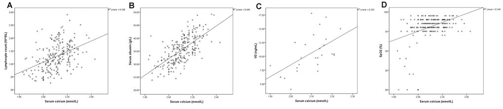 The SPSS scatterplots and correlation analyses of serum calcium and the blood biomarkers are shown in Figures 1 and 2. The serum calcium levels were significantly positively correlated with lymphocyte count (Figure 1A, P <0.001), albumin levels (Figure 1B, P <0.001), VD levels (Figure 1C, P =0.004), and lowest SpO2 (Figure 1D, P< 0.001), whereas they are significantly negatively correlated with CRP (Figure 2A, P< 0.001), D-dimer (Figure 2B, P< 0.001) and PTH (Figure 2C, P =0.048) levels. These results indicated that hypocalcemia may be associated with imbalanced VD and PTH in the acute phase of COVID-19.