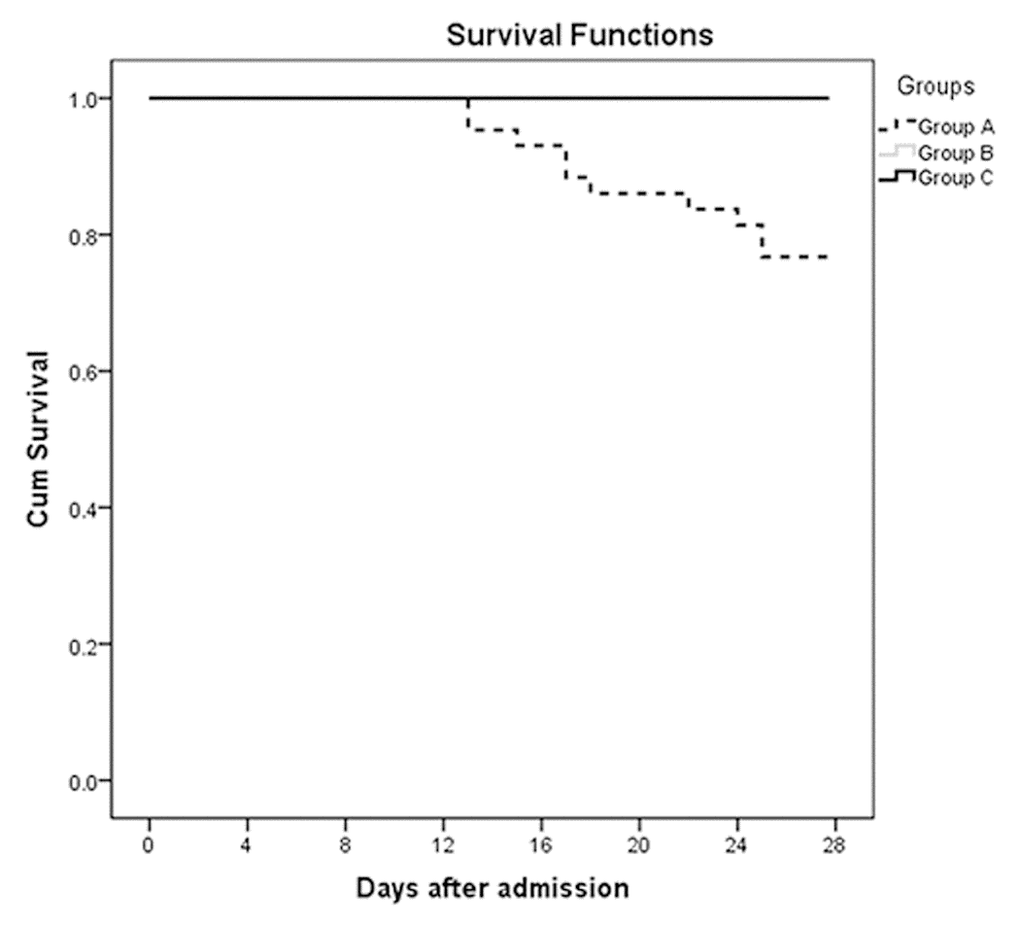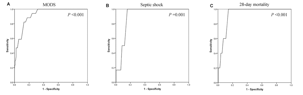 ROC curves were also performed to assess the associations between serum calcium and MODS, septic shock, and 28-day mortality. As shown in Figure 3, the area under the curves (AUCs) of MODS (Figure 3A), septic shock (Figure 3B), and 28-day mortality (Figure 3C) were 0.923 (P <0.001), 0.905 (P =0.001), and 0.929 (P <0.001), respectively. Optimal cut-off points of serum calcium values were derived from the ROC curves. The optimal cut-off point for MODS was 2.035 mmol/L, the sensitivity was 88.2%, and the specificity was 82.6%. The optimal cut-off point for septic shock was 2.01 mmol/L, the sensitivity was 100.0%, and the specificity was 84.3%. The optimal cut-off point for 28-day mortality was 2.01 mmol/L, the sensitivity was 100.0%, and the specificity was 85.7%. Figure 4 shows the significant differences in the 28-day mortality among groups A, B, and C. The 28-day mortality of group A was significantly higher than that of groups B or C (P <0.001). No difference was found between groups B and C (P >0.05).