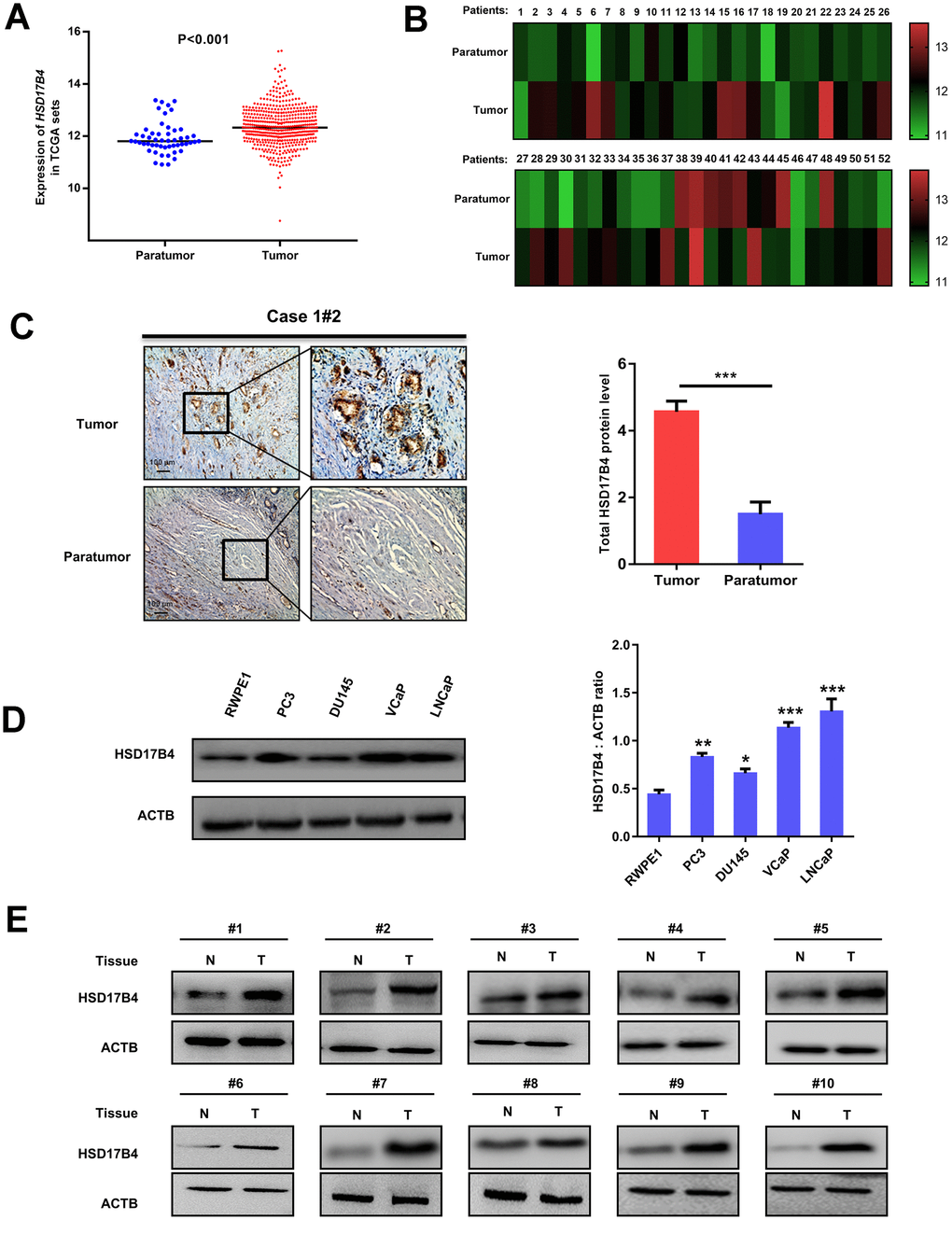 Previous results have reported that HSD17B4 is a multiple-function enzyme involved in the progression of various cancers, including PCa [9, 17]. To elucidate the role of HSD17B4 in PCa pathogenesis, we analyzed HSD17B4 mRNA levels in published profiles from PCa patients and found that HSD17B4 was upregulated in PCa samples (498 cases) compared with levels in adjacent normal tissue samples (52 cases) (P < 0.001) (Figure 1A and Supplementary Table 2). Furthermore, we found that the expression of HSD17B4 in a total of 52 paired PCa tissues was significantly higher compared with that in their adjacent normal tissues (P < 0.01) by TCGA dataset analysis (Figure 1B). Then, we examined the HSD17B4 protein level in human PCa tissues. We collected 10 pairs of paraffin-embedded human PCa samples with adjacent normal tissues for immunohistochemistry. The results showed that, compared with the matched normal prostate tissues, 10 pairs of samples showed a significant increase (P < 0.001) in total HSD17B4 protein in cancerous tissues (Figure 1C and Supplementary Table 1). Then, we collected several PCa cells (LNCaP, VCaP, DU145, and PC3) and a nonmalignant human prostate epithelial cell line (RWPE-1). HSD17B4 protein levels were examined by western blotting. The results showed that the level of HSD17B4 was higher in malignant PCa cells than that in normal cells (Figure 1D, left panel), and statistical analysis revealed the difference in HSD17B4 protein expression in those prostate cells (P < 0.001) (Figure 1D, right panel). Furthermore, we collected 20 pairs of human PCa tissues with adjacent normal prostate tissues for direct immunoblotting. In most samples, the levels of total HSD17B4 protein were higher in the tumor tissues compared with levels in the normal prostate tissues (Figure 1E and Supplementary Figure 1). Taken together, these data imply an important role of HSD17B4 in PCa and indicate a prospective application of using HSD17B4 as a potential biomarker for PCa diagnosis.