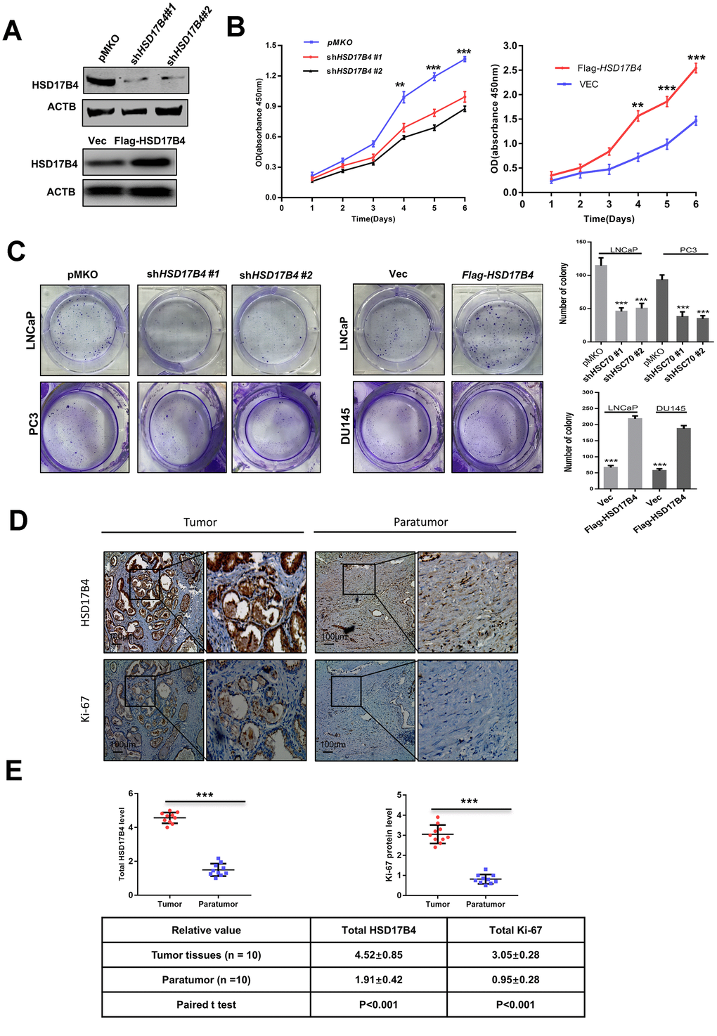 To explore the function of HSD17B4 in cancer cells, we knocked down endogenous HSD17B4 by shRNA or overexpressed exogenous Flag-HSD17B4 in PCa cells (Figure 2A and Supplementary Figure 2A) and detected a significant difference in the proliferating velocity and colony formation (Figure 2B–2C and Supplementary Figure 2B). Ki-67 is a nuclear nonhistone protein that is universally expressed among proliferating cells and absent in quiescent cells [18, 19]. Research studies have shown that high levels of Ki-67 are associated with poor malignant cancer survival [20, 21]. The finding that HSD17B4 can increase PCa cell proliferation prompted us to examine both HSD17B4 and Ki-67 protein in human PCa tissues. We collected a total of 10 primary human PCa samples and 10 adjacent normal prostate samples and determined the levels of both HSD17B4 and Ki-67 protein by immunohistochemistry in paraffin-embedded tissues. In most samples, the levels of both HSD17B4 and Ki-67 protein were higher in the tumor tissues compared with levels in the normal prostate tissues (Figure 2D). Statistical analysis of quantified images indicated that the differences in HSD17B4 protein levels (P < 0.001) and in Ki-67 protein levels (P < 0.001) between tumor and normal tissues are all significant (Figure 2E). These data indicate that HSD17B4 may be a potential biomarker together with Ki-67 in predicting proliferative PCa.