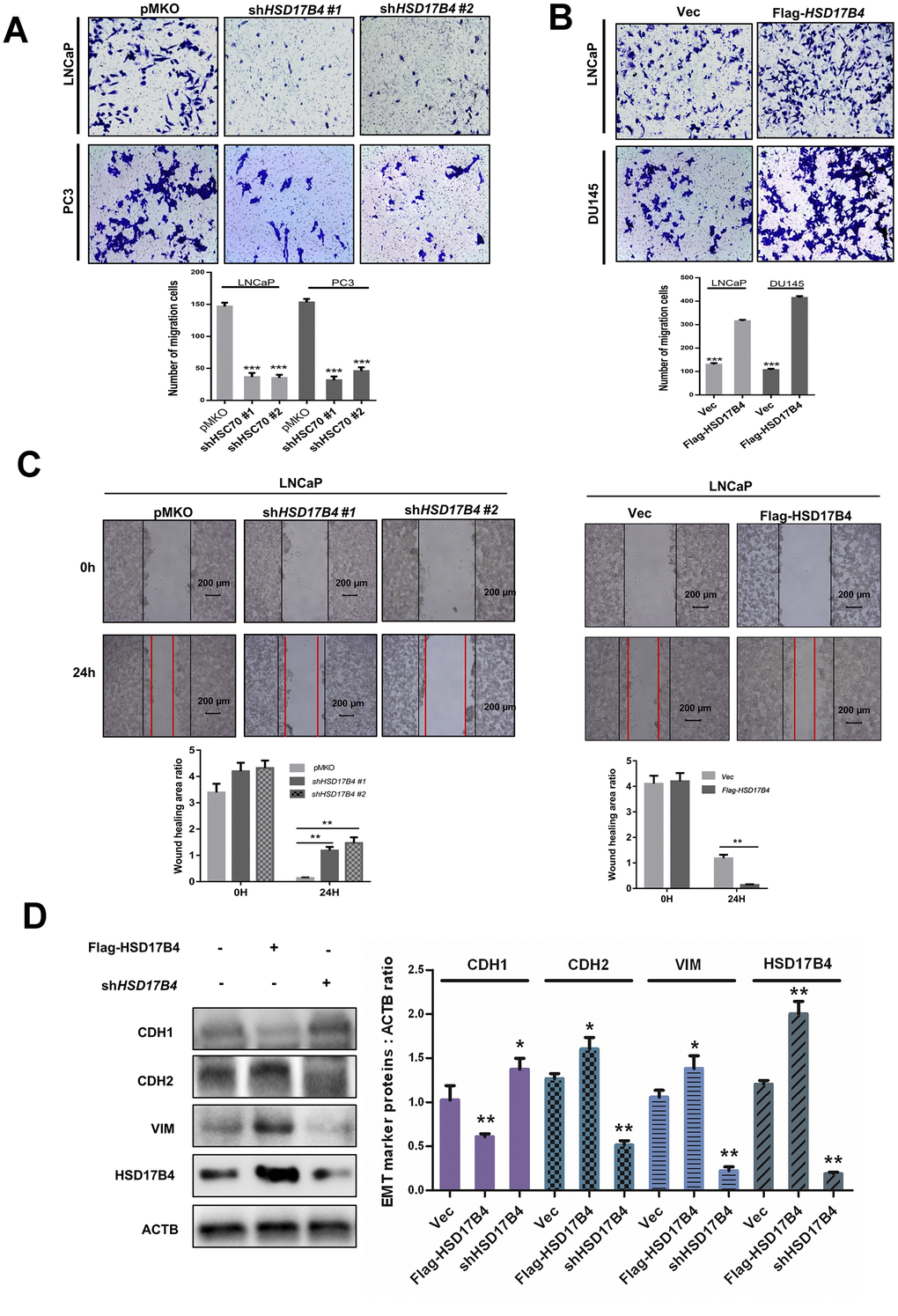 Next, we performed migration assays in 24-well chambers and found that HSD17B4 knockdown significantly suppressed the migration of PCa cells, while overexpression of HSD17B4 promoted the number of migrating cells (Figure 3A–3B). The wound-healing assay obtained a similar result in which HSD17B4 regulated the migration of PCa cells (Figure 3C). EMT means that cells transit from an epithelial phenotype to mesenchymal properties. CDH1 is decreasing while CDH2 and Vimentin are increasing during EMT, and then cells lose their polarity and adhesiveness and subsequently migrate faster. Interestingly, we knocked down HSD17B4 in LNCaP cells and found an increase in CDH1 but a decrease in CDH2 and Vimentin. However, the overexpression of HSD17B4 plays an opposite role (Figure 3D). These findings demonstrate that HSD17B4 plays important roles in enhancing the malignant capacities of PCa cells.