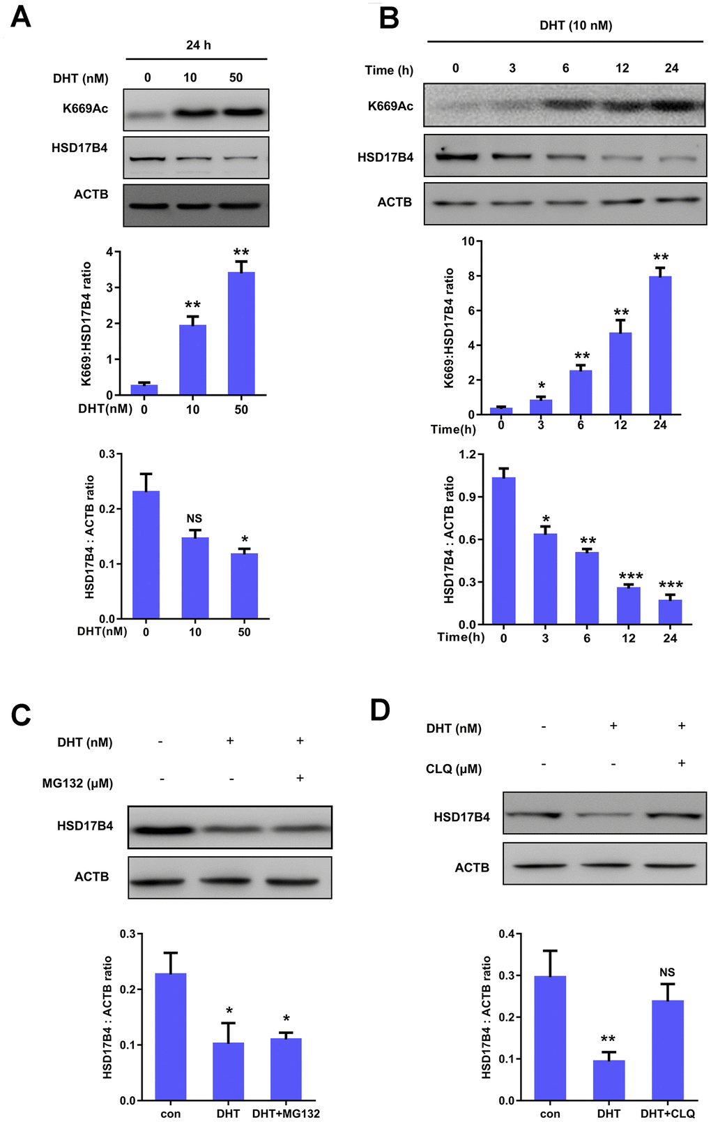 We further investigated the molecular mechanism of HSD17B4 in PCa. To determine whether DHT can serve as a physiological signal and dynamically regulate HSD17B4 protein levels in PCa, we cultured LNCaP cells under hormone-deprived conditions for 24 h, followed by treating the cells with DHT at different concentrations for another 24 h, and found that 10 nM extracellular DHT dramatically decreased the protein level of HSD17B4 (Figure 4A). Further results indicated that DHT promoted HSD17B4 degradation in a time-dependent manner (Figure 4B). The degradation of HSD17B4 triggered by DHT also suggests a negative feedback mechanism. A previous study showed that K669 acetylation promotes HSD17B4 degradation through CMA [22]. We then examined the K669 acetylation level and found that 10 nM DHT increased the K669 acetylation level in both a time-dependent and dose-dependent manner (Figure 4A–4B). Our data demonstrate that K669 acetylation can promote the degradation of HSD17B4 in PCa cells. In order to verify which mechanism is responsible for HSD17B4 degradation, we treated LNCaP cells with the ubiquitin proteasome inhibitor MG132 and the lysosomal inhibitor chloroquine (CLQ). Then, we determined the levels of total HSD17B4 protein by western blotting. The results showed that CLQ, but not MG132, restored the HSD17B4 protein level, which was reduced by physiological signal treatment (Figure 4C–4D), indicating that the degradation of HSD17B4 is independent of the proteasome pathway. Thus, we speculated that the lysosome system may participate in the degradation of HSD17B4.