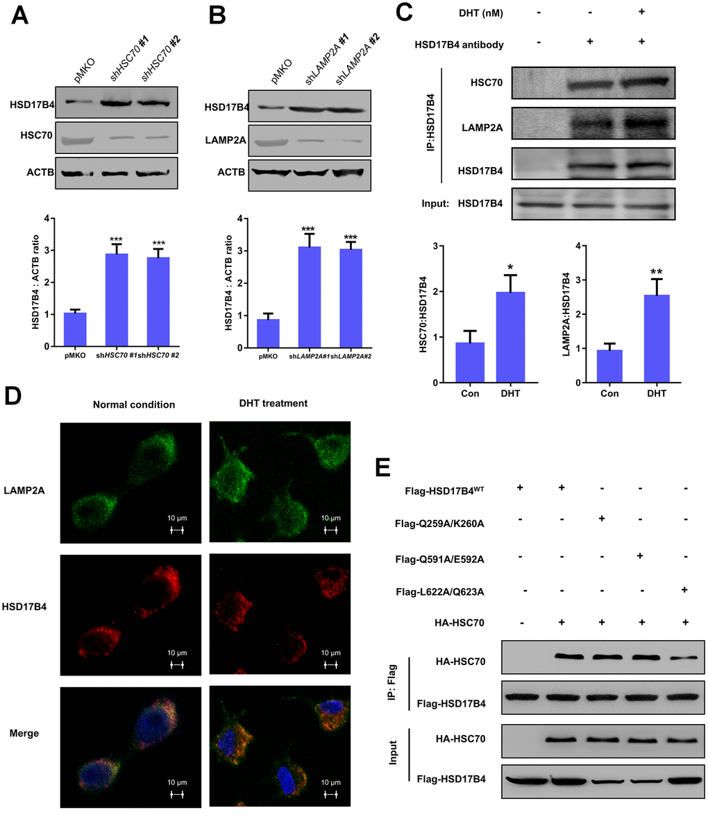 There are three classic lysosomal autophagy mechanisms, namely, macroautophagy, microautophagy and CMA, that participate in the degradation of multiple proteins [23]. In the CMA pathway, the Heat Shock Protein Family A Member 8 (HSC70) carries target proteins to the lysosomal receptor LAMP2A. Then, LAMP2A translocates the target proteins into lysosomes for degradation [24]. To identify which mechanism is responsible for HSD17B4 degradation, we knocked down HSC70 and LAMP2A in LNCaP cells and observed a significant increase in HSD17B4 protein (Figure 5A–5B). Moreover, extracellular DHT not only exclusively increased the interaction between HSC70 and HSD17B4 but also the interaction between HSD17B4 and LAMP2A (Figure 5C). Consistently, costaining of HSD17B4 and the lysosomal marker LAMP2A also indicates that DHT promotes the colocalization of HSD17B4 and LAMP2A (Figure 5D), consistent with a promoting role of DHT in HSD17B4 degradation through CMA. These data implied the involvement of CMA in HSD17B4 degradation.