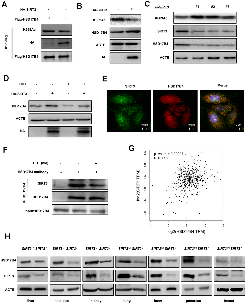 Previous studies have suggested that SIRT3 is responsible for acetylation of HSD17B4 in breast cancer cells [22]. We transfected HA-tagged SIRT3 and FLAG-tagged HSD17B4 into LNCaP cells and determined the acetylation level of HSD17B4 by western blotting. As a result, HA-tagged SIRT3 significantly decreased the K669 acetylation level of HSD17B4 (Figure 6A). A previous study reported that acetylation promotes HSD17B4 degradation. Therefore, we investigated whether SIRT3 affected the protein level of HSD17B4 in PCa. We transfected HA-tagged SIRT3 into LNCaP cells and observed that SIRT3 overexpression caused a decrease in K669 acetylation but an accumulation of HSD17B4 protein (Figure 6B). Consistently, SIRT3 knockdown increased K669 acetylation and reduced HSD17B4 protein levels at the same time (Figure 6C). Moreover, we treated LNCaP cells with or without 10 nM DHT and found that SIRT3 restored the protein level of HSD17B4, which emphasized the important role of SIRT3 in stabilizing HSD17B4 (Figure 6D). Confocal microscopy data indicated an interaction between SIRT3 and HSD17B4 (Figure 6E). However, DHT exclusively decreased the interaction between endogenous SIRT3 and HSD17B4 (Figure 6F). According to previous studies, SIRT3 mainly functions in the mitochondria, while HSD17B4 plays a major role in peroxisomes [27, 28]. We then analyzed the relationship between SIRT3 and HSD17B4 in PCa patients via the GEPIA (Gene Expression Profiling Interactive Analysis) web server and found that SIRT3 is positively correlated with HSD17B4 (Figure 6G). To better understand whether SIRT3 regulates HSD17B4 protein levels in vivo, pairs of normal mouse and SIRT3 knockout mouse models were applied. Taking advantage of the mouse model, we collected different mouse tissues and detected endogenous HSD17B4 and SIRT3 protein levels. The results showed a positive correlation between SIRT3 and HSD17B4 (Figure 6H). Collectively, these data demonstrate that SIRT3 regulates HSD17B4 acetylation and blocks HSD17B4 degradation induced by DHT treatment.