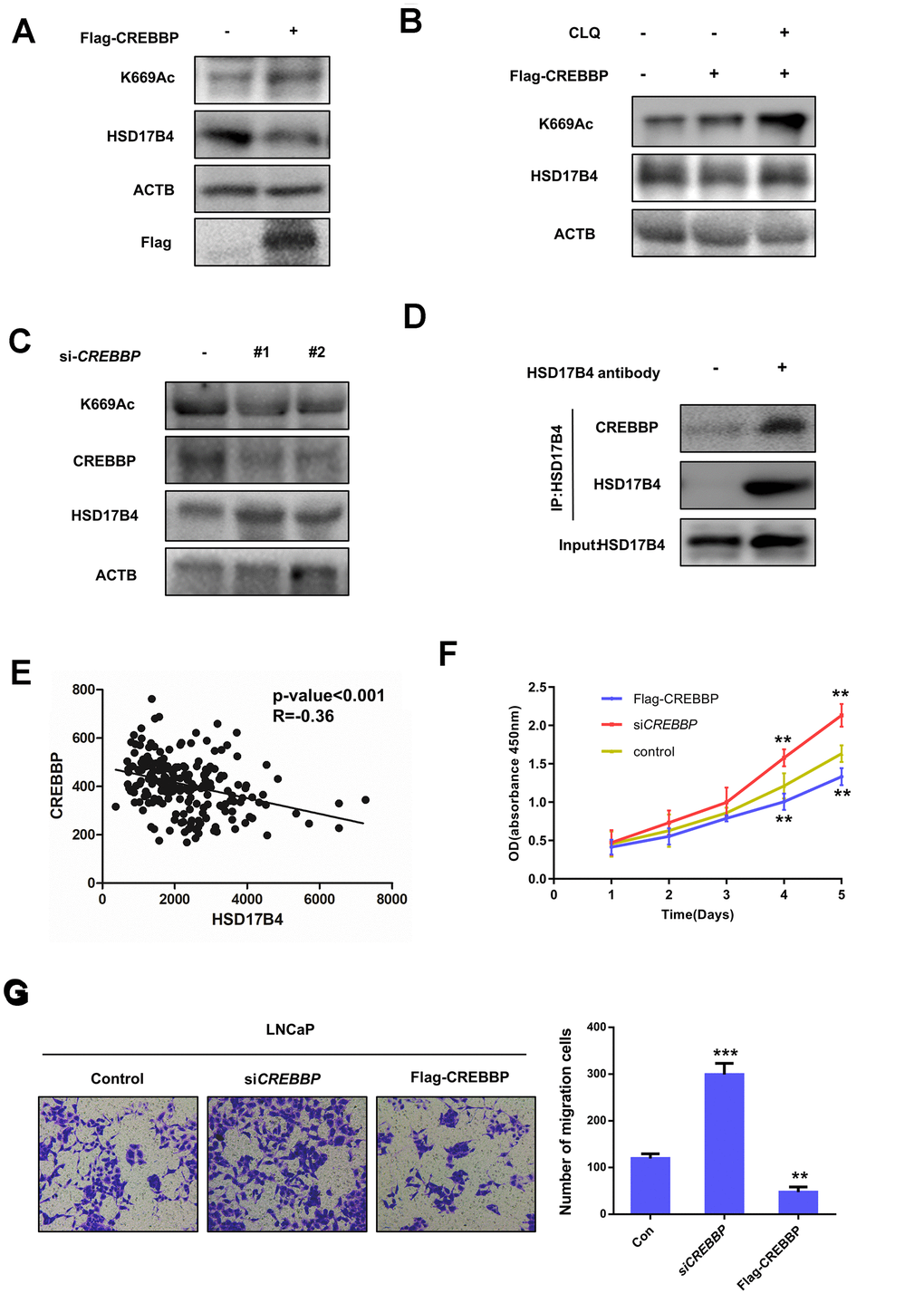 In addition, we found that the overexpression of CREBBP in LNCaP cells obviously increased the HSD17B4 K669 acetylation level but decreased its protein level inversely (Figure 7A). This downregulation of HSD17B4 protein could be blocked by CLQ treatment (Figure 7B), indicating the positive role of CREBBP in K669 acetylation-induced CMA degradation of HSD17B4. Further experiments showed that CREBBP knockdown dramatically decreased K669 acetylation but increased HSD17B4 protein levels (Figure 7C). We observed a direct interaction between endogenous HSD17B4 and CREBBP in LNCaP cells (Figure 7D). Moreover, the analysis based on the GSE70770 database showed that CREBBP is negatively correlated with HSD17B4 (Figure 7E). We then performed a CCK-8 cell proliferation assay and found that the overexpression of CREBBP significantly decreased the proliferation rate of LNCaP cells, while the knockdown of CREBBP by siRNA promoted the proliferation rate (Figure 7F). Consistently, the overexpression of CREBBP inhibited the migrating capability of LNCaP cells, while the knockdown group showed an increased number of migration cells compared with that in the control group (Figure 7G). Taken together, our data demonstrate that CREBBP plays an important role in HSD17B4 degradation and may be the main acetyltransferase responsible for HSD17B4 acetylation.