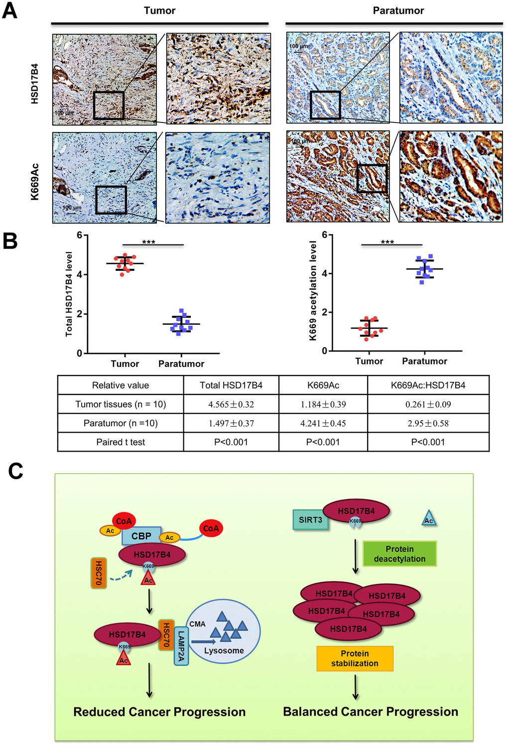 To substantiate the important role of K669 acetylation in PCa, we collected a total of 10 primary human PCa samples and 10 adjacent normal samples. Taking advantage of the anti-acetyl-HSD17B4 (K669) antibody, we performed immunohistochemistry in these PCa tissues and adjacent normal prostate tissues. Compared with the normal prostate tissues, the levels of total HSD17B4 were higher and the levels of relative K669-acetylated HSD17B4 were lower in the tumor tissues (Figure 8A). Statistical analyses of quantified images indicated that the differences in total HSD17B4 protein levels (P < 0.001), in K669-acetylated HSD17B4 (P < 0.001), and in the ratio of K669-acetylated HSD17B4 versus total HSD17B4 proteins (P < 0.001) between tumor and normal tissues are all significant (Figure 8B). These data further validate that K669 acetylation of HSD17B4 promotes its degradation in human PCa tissues.