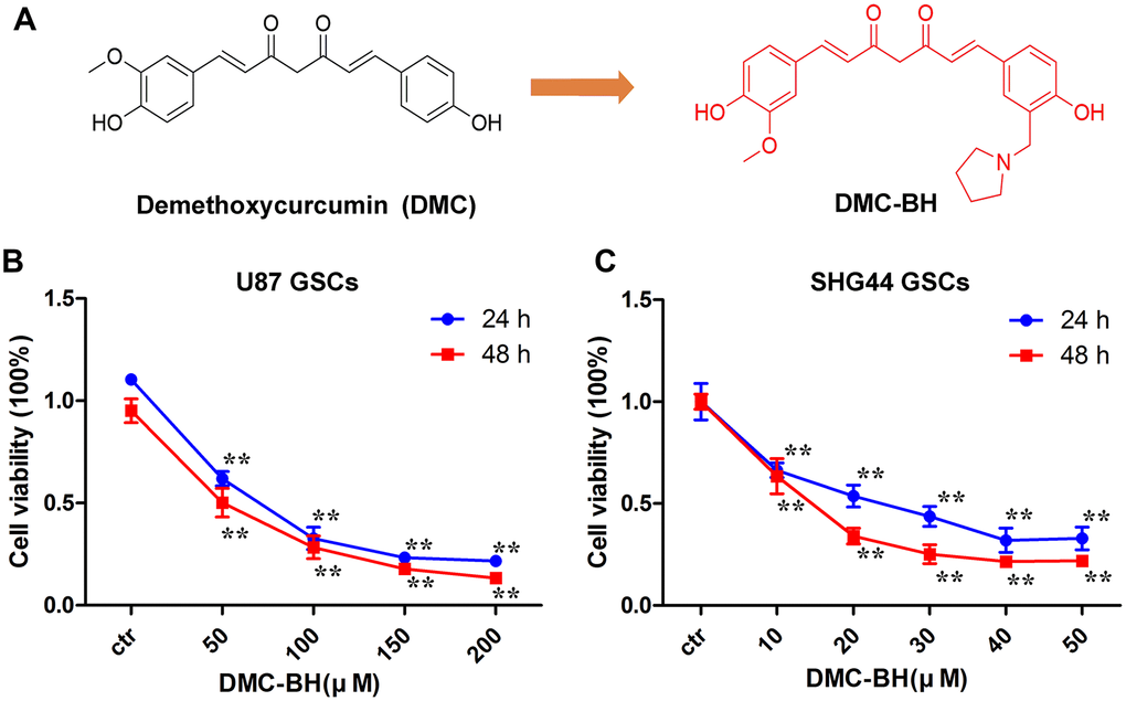 To investigate whether DMC-BH (Figure 1A) inhibits proliferation of GSCs, we analyzed in vitro growth of U87 and SHG44 GSCs incubated with DMC-BH for 24 and 48 h, using MTT assay. As shown in Figure 1B, 1C, DMC-BH significantly inhibited GSCs cell proliferation in a dose- and time dependent manner.