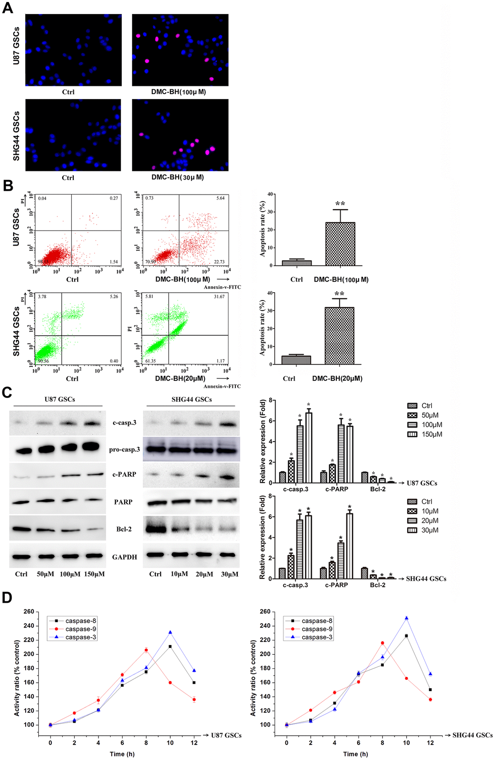 To determine whether the DMC-BH-mediated inhibition of GSCs proliferation was associated with increase-edapoptosis, we analyzed apoptosis using TUNEL staining assay and Annexin V-FITC/PI double staining in U87 and SHG44 GSCs. As shown in Figure 2A, DMC-BH significantly increased the number of TUNEL positive cells. Further, using the Annexin assay, DMC-BH significantly increased the apoptotic rates in U87 (21.37% ±6.11) and SHG44 (27.10% ±4.00) GSCs (Figure 2B). Western blot results demonstrated that cleaved caspase-3, the crucial apoptosis executor, was increased after 24 h DMC-BH exposure (Figure 2C). Furthermore, cleaved PARP (poly (ADP-ribose) polymerase), the substrate of caspase-3, was significantly increased in GSCs after DMC-BH exposure. In addition, expression of the anti-apoptotic protein Bcl-2 decreased in GSCs after DMC-BH exposure. The increased levels of cleaved caspase-3 and PARP were associated with significantly increased activities of caspase-8, -3, and -9 after DMC-BH exposure in GSCs (P<0.05)(Figure 2D).