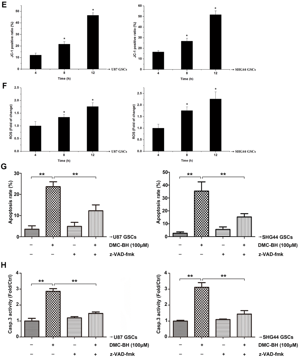 Our results showed that 100 μM DMC-BH time-dependently decreased the mitochondrial transmembrane potential (MTP) in GSCs (Figure 2E). In addition, as shown in Figure 2F, ROS production increased after 100 μM DMC-BH treatment in U87 and SHG44 GSCs. To determine whether the DMC-BH-induced apoptosis was caspase-dependent, we used the pan-caspase inhibitor z-VAD-fmk. Our data showed that z-VAD-fmk could partially rescue the DMC-BH-induced apoptosis (Figure 2G), and reduce the DMC-BH-induced activation of caspase-3 in GSCs (Figure 2F). These results indicate that DMC-BH induces apoptosis in GSCs by the mitochondria dependent pathway.
