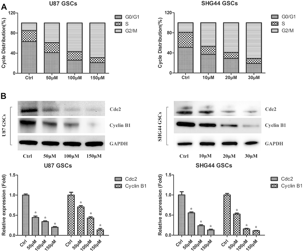 Next, we evaluated the effect of DMC-BH on cell cycle arrest of U87 and SHG44 GSCs. As shown in Figure 3A, increasing concentrations of DMC-BH dose-dependently increased the number of U87 and SHG44 cells in the G2/M phase. In addition, western blot analysis demonstrated that DMC-BH dose-dependently decreased the levels of cell cycle related proteins Cdc2 and Cyclin B1 in U87 and SHG44 cells (Figure 3B). Together, these results indicate that DMC-BH induces the G2/M cell cycle arrest in GSCs.