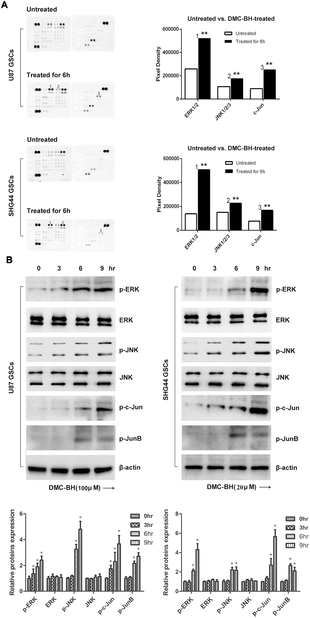 To examine which signaling pathway is activated in GSCs by DMC-BH, we used the Proteome Profiler Human Phospho-Kinase Array assay in U87 and SHG44 cells exposed to 20 and 100 μM DMC-BH for 6 h. As shown in Figure 4A, DMC-BH significantly increased phosphorylation levels of JNK, ERK and c-Jun in GSCs. The increased phosphorylation levels of p-Jun and p-ERK in DMC-BH-treated GSCs were also confirmed by western blotting (Figure 4B). In addition, DMC-BH increased the phosphorylation levels of JNK/ERK downstream proteins c-Jun and JunB in GSCs, indicating that DMC-BH activates the MAPK pathway in GSCs.
