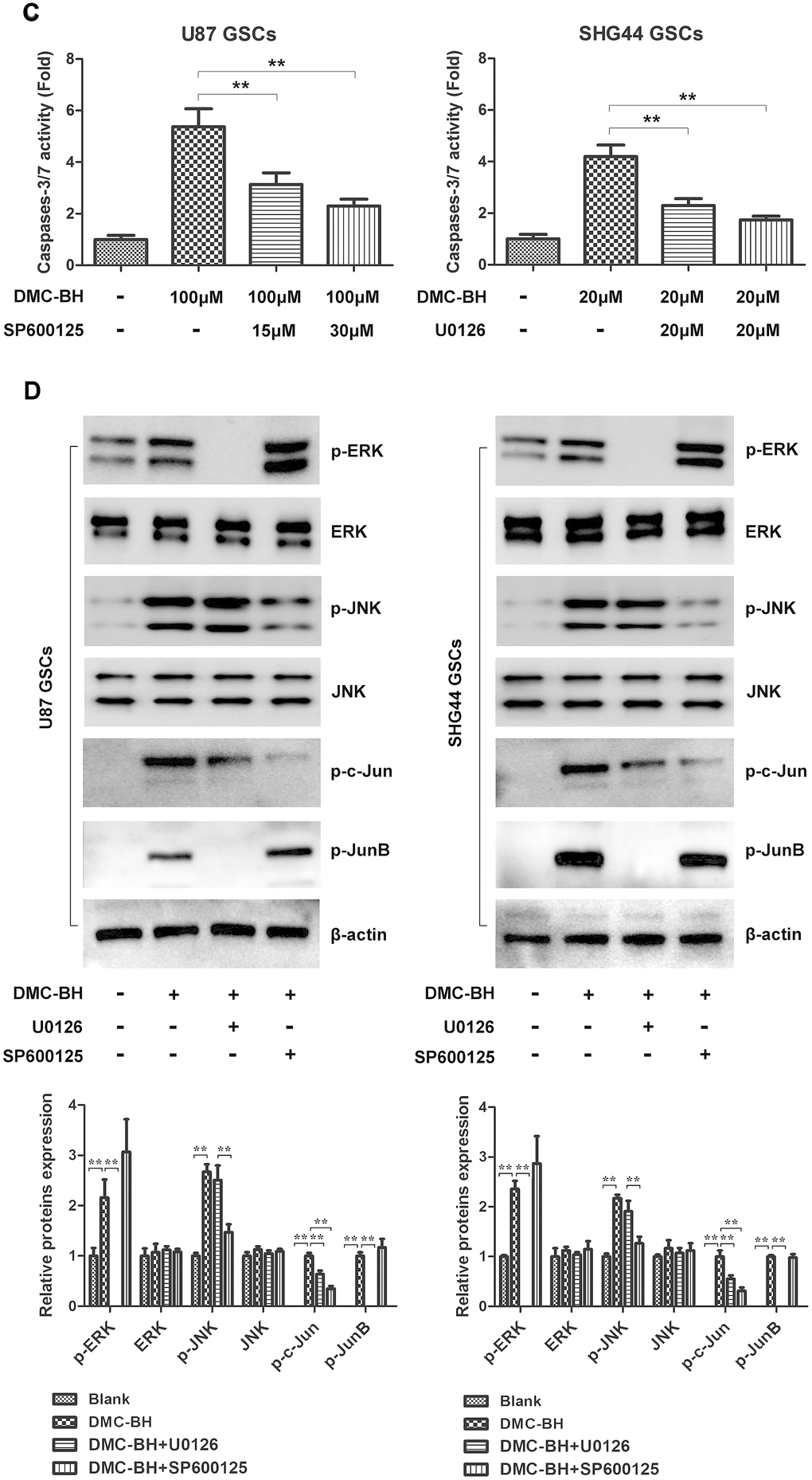 (C) Caspase-3 activity measured after incubation with ERK inhibitor U0126 (20 μM) or JNK inhibitor SP600125 (30 μM). (D) Phosphorylated levels of MAPK-related proteins analyzed in DMC-BH-treated GSCs in the presence of U0126 (20 μM) or SP600125 (30 μM); n =3.