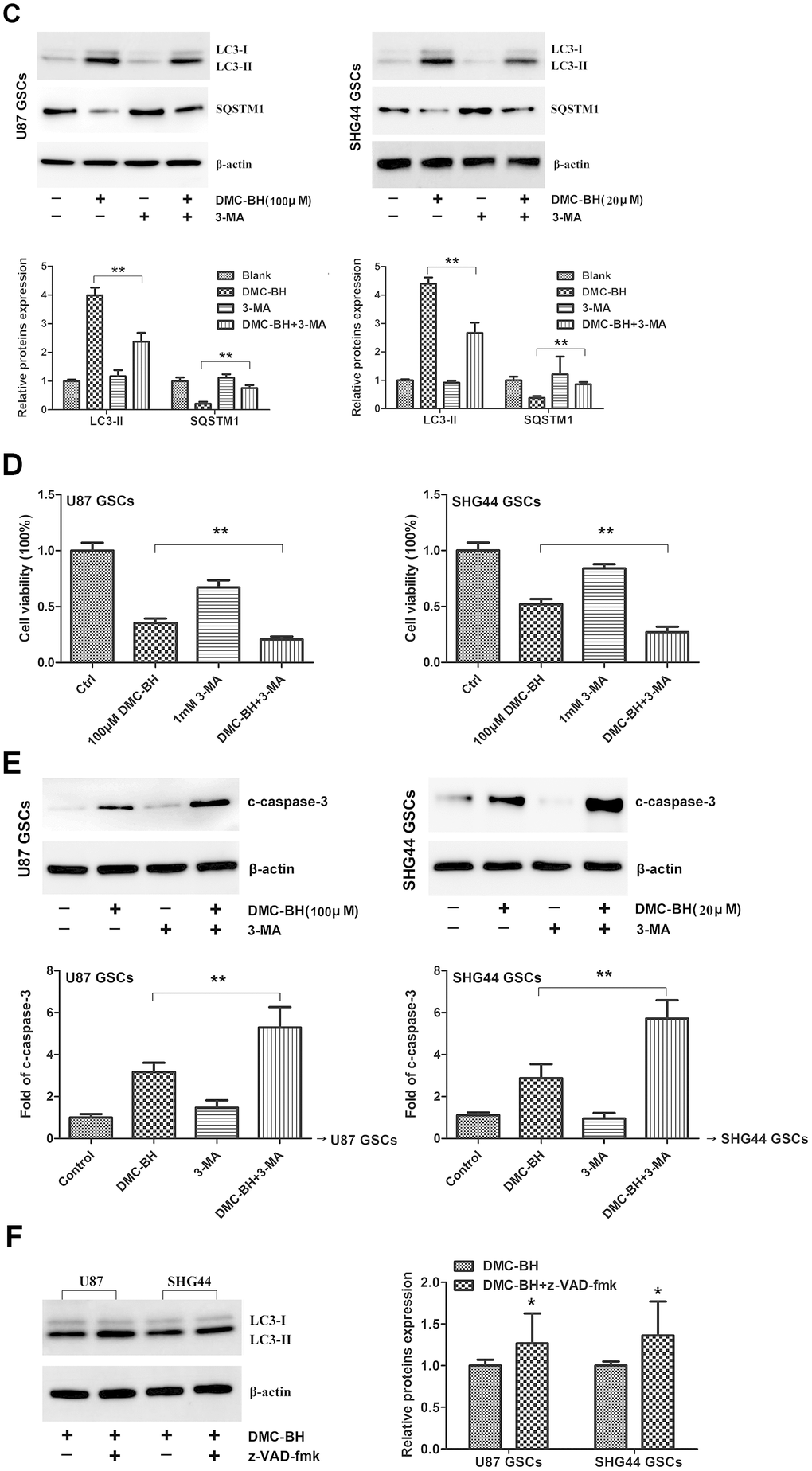 (C) SQSTM1 and LC3 II protein levels analyzed in DMC-BH treated GSCs in the presence of the autophagy inhibitor, 3-MA (1 mM; 3h) by western blotting. (D) Cell viability analyzed by MTT assay. (E) Western analysis of cleaved caspase-3 analyzed in GSCs incubated with DMC-BH +/- 3-MA by western blotting. (F) Western analysis of LC3 II protein levels in GSCs incubated with DMC-BH (100 μM and 20 μM) and/or z-VAD-fmk for 24 h; n =3.