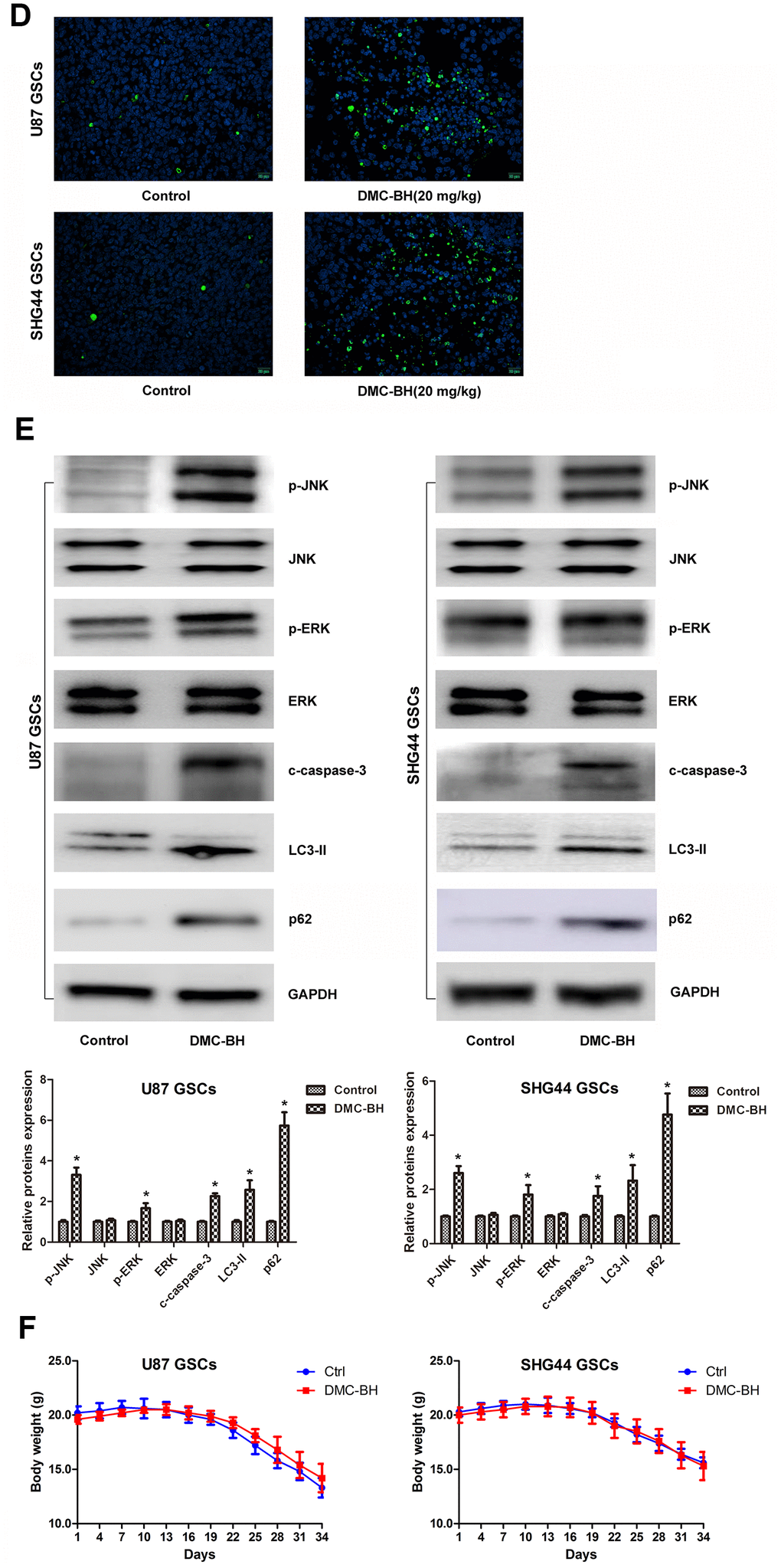 (D) Apoptosis of intracranial tumor analyzed by TUNEL assay. (E) Western analysis of c-caspase-3, LC3-II, p-ERK and p-JNK levels in intracranial tumors. (F) Body weight loss in DMC-BH-treated and control mice; n =10.