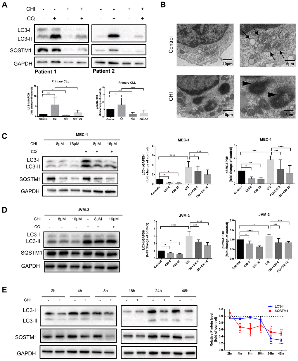 Figure 1. Chidamide decreases autophagic flux in CLL cells. (A) Immunoblotting analysis of autophagic flux in primary CLL cells after chidamide (CHI, 4μmol/L) treatment for 24 hours in the presence or absence of chloroquine (CQ, 10μmol/L). LC3 and SQSTM1 are indicated, as well as GAPDH that was used as a loading control. Shown are two representative blots from the samples of 16 patients. (B) Electron microscopic analysis of primary CLL cells in the presence or absence of chidamide (CHI, 4μmol/L) treatment for 24 hours. Arrows indicate autophagic structures and arrowheads indicate fragments of nucleus. (C, D) Immunoblotting analysis of autophagic flux in MEC-1 and JVM-3 cell lines respectively after chidamide (CHI, 8 or 16μmol/L) treatment for 24 hours in the presence or absence of chloroquine (CQ, 10μmol/L). (E) Levels of LC3 and SQSTM1 were assessed by immunoblotting in the presence or absence of chidamide (8μmol/L) in time-course experiments in MEC-1 cell line. GAPDH was used as a loading control. The bar graphs and the line graph showed the expression level of proteins with respect to the control groups. *P < 0.05; **P < 0.01; ***P < 0.001; ***P<0.0001.