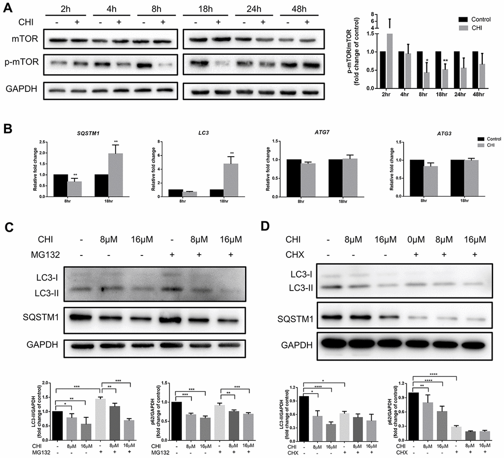 Figure 2. Chidamide inhibits autophagy in mTOR-independent way by post-transcriptionally regulation in CLL cells. (A) The effect of chidamide on the PI3K/AKT/mTOR pathway was assessed in MEC-1 cells by immunoblotting through the analysis of the phosphorylation status of mTOR during time course in presence or absence of chidamide (CHI, 16μmol/L). The bar graph showed the relative expression level of p-mTOR/mTOR with respect to the control groups. (B) The effect of chidamide on modulating autophagy gene expression in transcriptional level. MEC-1 cells were treated with chidamide (CHI, 16μmol/L) for 8 or 18 hours, then autophagy-related genes LC3, SQSTM1, ATG7, and ATG3 were determined by qRT-PCR. ΔCt was used to measure statistical significance and the results were shown in the bar graphs. (C, D) MEC-1 cells were treated with chidamide (CHI, 8 or 16μmol/L) alone or in presence of MG132 (20μmol/L) or cycloheximide (CHX, 20μmol/L), collected after 24 hours and immunoblotted with antibodies against LC3 and SQSTM1. The bar graphs showed the expression level of proteins with respect to the control groups.