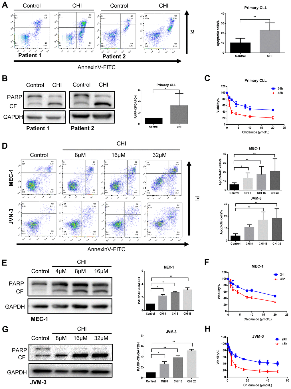 Figure 3. Chidamide has cytostatic and cytotoxic effects on CLL cells. (A) Flow cytometry using Annexin V–FITC/PI staining for cell apoptosis analysis. Primary CLL cells were incubated with 4μmol/L chidamide for 24 hours. Representative data shown are from 9 patients and three independent experiments of MEC-1, JVM-3 respectively. The bar graphs showed the percentage of apoptotic cells. (B) Immunoblotting analysis of poly (ADP-ribose) polymerase (PARP) in primary CLL cells after chidamide (CHI, 4μmol/L) treatment for 24 hours. Shown are 3 representative blots from the samples of 6 patients. The bar graph represents the relative PARP cleavage/GAPDH ratio measured by immunoblotting. (C) CCK8 assay for detecting metabolically active cells. Primary CLL cells were incubated with different concentrations of chidamide for 24 and 48 hours. Viability of cells compared with the corresponding controls was shown from three independent experiments respectively. (D) Cell apoptosis assay as described in (A). MEC-1, JVM-3 cell lines were incubated with indicated concentrations of chidamide for 24 and 48 hours. (E, G) Immunoblotting analysis of PARP as described in (B). MEC-1 and JVM-3 cell lines were incubated with indicated concentrations of chidamide for 24 hours. (F, H) CCK8 assay as described in (C). MEC-1, JVM-3 cell lines were incubated with different concentrations of chidamide for 24 and 48 hours.