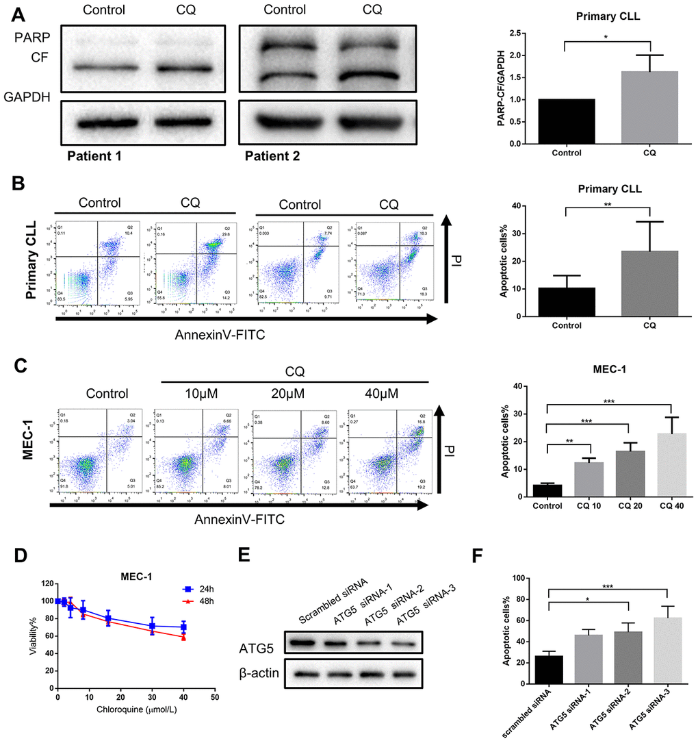 Figure 4. Inhibition of autophagy recapitulates the effect of chidamide. (A) Immunoblotting analysis of poly (ADP-ribose) polymerase (PARP) in primary CLL cells after chloroquine (CQ, 10μmol/L) treatment for 24 hours. Shown are 2 representative blots from the samples of 6 patients. The bar graph represents the relative PARP cleavage/GAPDH ratio measured by immunoblotting. (B, C) Flow cytometry using Annexin V–FITC/PI staining for cell apoptosis analysis. Primary CLL cells were incubated with 10μmol/L chloroquine for 24 hours while MEC-1 cell line were incubated with indicated concentrations of chidamide for 24 hours. Representative data shown are from 9 patients and three independent experiments of MEC-1. The bar graphs showed the percentage of apoptotic cells. (D) CCK8 assay for detecting metabolically active cells. MEC-1 cell lines was incubated with indicated concentrations of chloroquine for 24 and 48 hours. Viability of cells compared with the corresponding controls was shown from three independent experiments. (E, F) MEC-1 cells were transfected with ATG5 or nontargeting scrambled siRNA as indicated. Expression levels of targeted gene were analyzed by Immunoblotting. Percentage of apoptotic cells was assessed by flow cytometry following Annexin V-FITC/PI staining.