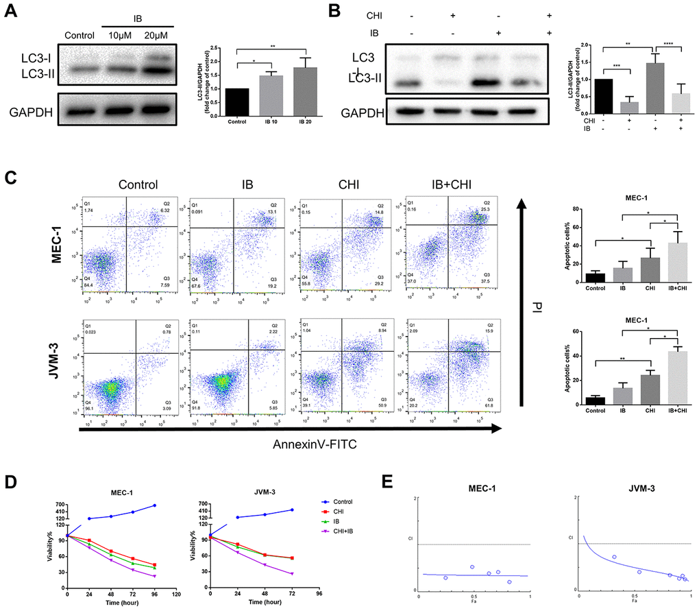 Figure 5. Chidamide and Ibrutinib have synergistic effect on CLL cells. (A) Immunoblotting analysis of LC3 in MEC-1 cell line cells after ibrutinib (IB, indicated concentrations) treatment for 48 hours. Representative data shown are from three independent experiments. The bar graph represents the relative PARP cleavage/GAPDH ratio measured by immunoblotting. (B) CCK8 assay for detecting metabolically active cells. MEC-1 and JVM-3 cell lines were incubated with indicated regimens (10μmol/L Ibrutinib, 20μmol/L chidamide alone or in combination) for 24 hours. Viability of cells compared with the corresponding controls was shown from three independent experiments. (C) Flow cytometry using Annexin V–FITC/PI staining for cell death analysis as mentioned before. MEC-1 and JVM-3 cell lines were incubated with indicated regimens (10μmol/L Ibrutinib, 20μmol/L chidamide alone or in combination) for 24 hours. The bar graphs showed the percentage of apoptotic cells. (D) Combination analyses were performed following the median-effect method 37. MEC-1 and JVM-3 cell lines were exposed to chidamide and Ibrutinib whose concentration were in a constant ratio of 2:1 simultaneously for 24 hours. The concentrations of chidamide used for these experiments were (in μmol/l) 1/2/10/20/40/50 while those of ibrutinib were (in μmol/l) 0.5/1/5/10/20/25 (shown as blue dots, and increasing from left to right along the x axis). CIs for different levels of growth inhibition (fraction affected) were calculated using the CompuSyn software. Details of CI and DRI values shown in Table 1. (E) Immunoblotting analysis of LC3 in MEC-1 cell line cells after ibrutinib (IB, 10μmol/L) treatment for 24 hours in the presence or absence of chidamide (CHI, 20μmol/L). The bar graph represents the relative expression level of LC3-II with respect to the control group.