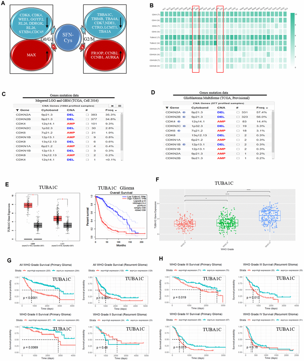 We recognized the significantly differential expressions of cell cycle-related proteins in response to SFN-Cys, and they were mainly expressed in G0/G1 and G2/M phases via HPLC-MS/MS and gene ontology analysis (Figure 1A). Further, we found that three mRNA expressions were closely related to the pathological grades and clinical prognosis in glioblastoma patients via the analysis of TCGA (The Cancer Genome Atlas) and CGGA (the Chinese Glioma Genome Atlas) databases, respectively with expressions of CDK4/CDK6 in G0/G1 phase and TUBA1C in G2/M phase (Figure 1E–1H), (Figure 2A–1H). The CDK4/CDK6 and TUBA1C mRNA levels were higher in glioblastomas than those in normal brain tissues (Figure 1B).