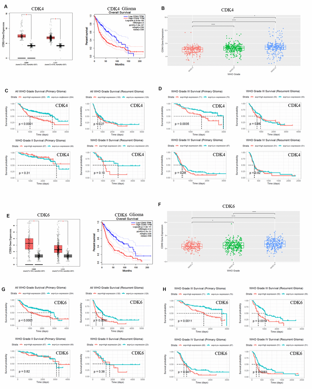 Survival data were available for 693 patients in CGGA and 676 patients in TCGA database, respectively. Survival rates of patients with higher CDK4/CDK6, TUBA1C expressions were significantly shorter than those of the counterparts (Figures 1E, 1G, 2A, 2C, 2E and 2G). Due to heterogeneity of glioma, we additionally investigated the patient prognosis with CDK4/CDK6 and TUBA1C expression in every grade of glioma in CGGA datasets. Results showed that patients with higher TUBA1C expression had shorter survival rates than those of the counterparts in grades II, III and IV primary glioma and grade III recurrent glioma, but not in grades II and IV recurrent glioma (Figure 1G, 1H). The patients with higher CDK4 expression had shorter survival rate than those of the counterparts in grade III primary glioma, but not in grades II and IV (Figure 1C, 1D). The patients with higher CDK6 expression had shorter survival rates than those of the counterparts in grades III and IV primary glioma and recurrent glioma, but not in stage II (Figure 2G, 2H). These findings indicated that TUBA1C and CDK4/CDK6 were important indicators for clinicopathological grades and prognosis of patients.