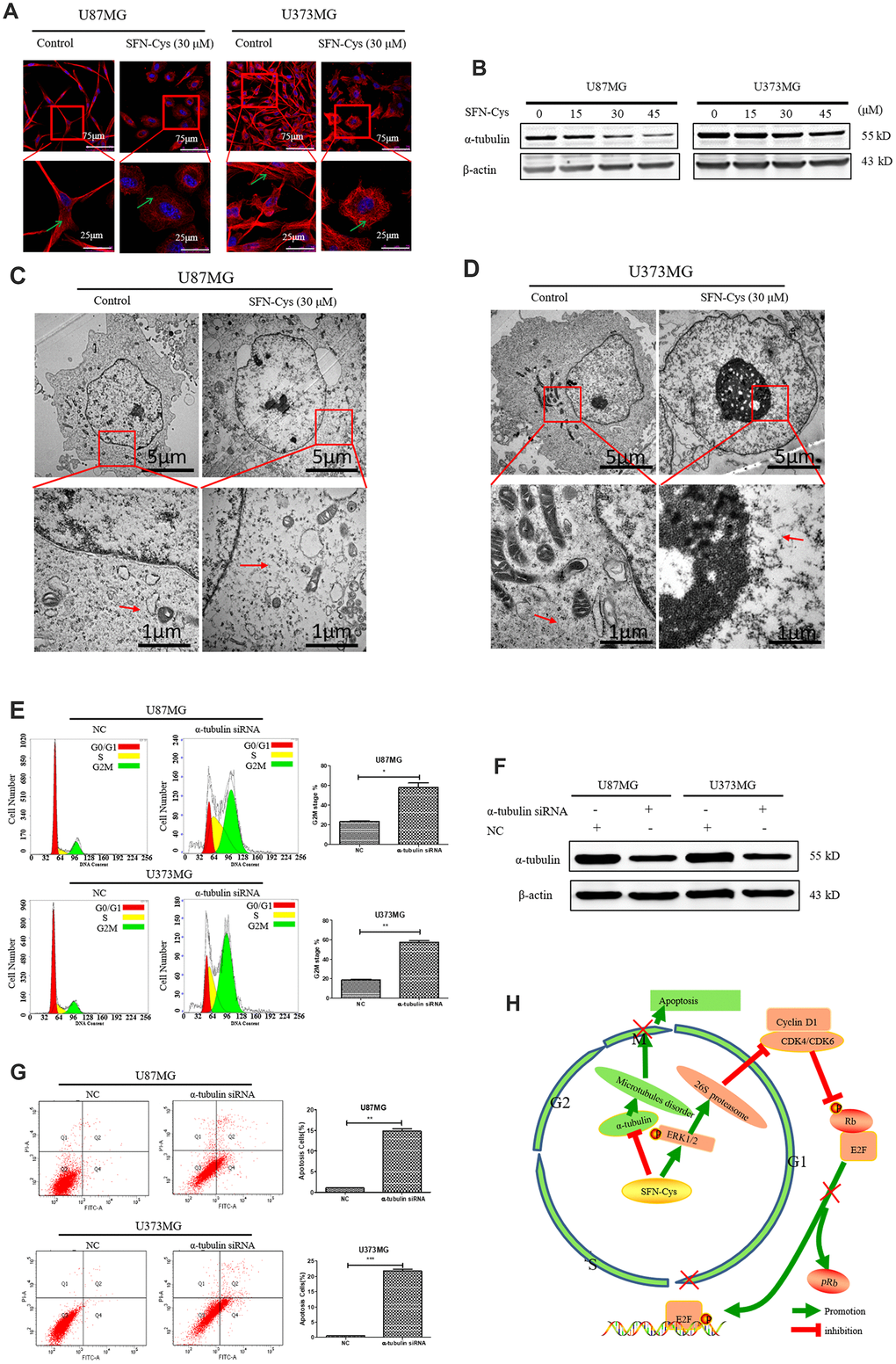 Microtubule disorganization and aggregation were shown in both U87MG and U373MG cells treated with SFN-Cys for 24 h via immunofluorescence (Figure 6A). Further, we observed that SFN-Cys significantly downregulated the expressions of α-tubulin in a dose-dependent manner (Figure 6B). Furthermore, microtubule disruption and aggregation were observed via transmission electron microscopy (TEM) (Figure 6C and 6D). These implied that SFN-Cys disrupted microtubules in both cell lines. We also found that the cell cycle was arrested in G2/M phase and apoptosis rates were significantly increased after the knockdown of α-tubulin (Figure 6E and 6F). The possible signaling map was shown for SFN-Cys-induced cell cycle arrest and apoptosis in human GBM cells (Figure 6H).