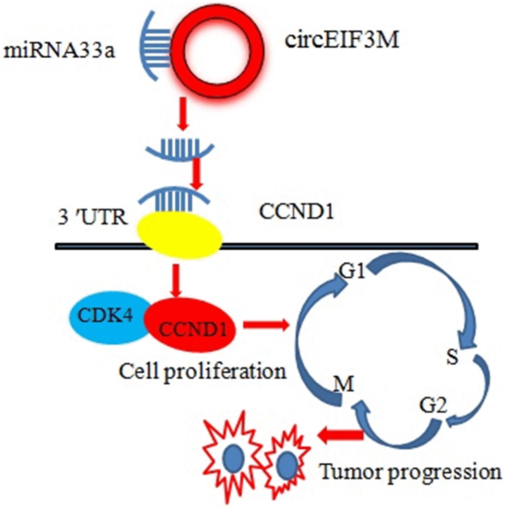 In the light of ceRNA hypothesis, circRNAs act as ceRNAs to increase expression of miRNA target genes. We found that CCND1 and circEIF3M are both overexpressed in TNBC. Notably, our bioinformatics analysis showed that CCND1 is a potential target of miR-33a, while a dual-luciferase reporter assay proved that miR-33a can directly bind to the 3'-untranslated region (3′-UTR) of CCND1. In addition, upregulation of miR-33a led to downregulation of CCND1 at both the mRNA and protein levels, while downregulation of miR-33a had the opposite effect. It is well known that CCND1 mainly coordinates with cyclin-dependent kinase 4 (CDK4) to regulate cell cycle progression. It is well established that CCND1-CDK4 activity is dysregulated in multiple cancers, including melanoma and breast cancer [14, 15]. Coincidentally, it was found that downregulation of circEIF3M can lead to cell cycle arrest.