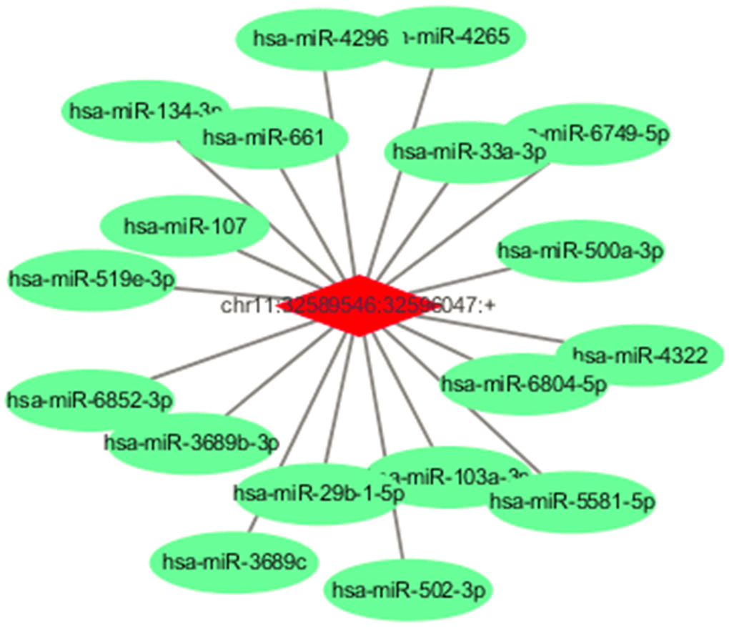 Because circRNAs contain corresponding miRNA binding sites and can act as miRNA sponges, to assess their potential functions in TNBC, we used miRNA target prediction software to investigate miRNAs intrinsically closely related to the identified differentially expressed circRNAs. The predicted miRNAs for the top one dysregulated circRNA are listed in Figure 2. For example, circRNA chr11:32589546:32596047:+ is predicted to harbor hsa-miR-33a-3p, hsa-miR-29b-1-5p, hsa-miR-107, and hsa-miR-134-3p. In addition, a circRNA-miRNA- mRNA network was constructed (Supplementary Figure 3), indicating a potential competing endogenous RNA (ceRNA) relationship among circRNA, miRNA, and mRNA in TNBC.