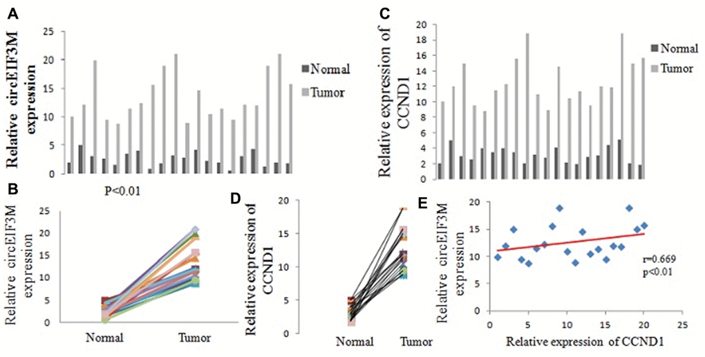 The expressions of circEIF3M were detected by Quantitative real time polymerase chain reaction (qRT-PCR) in 20 pairs of TNBC tissues. According to our RNA-seq data, the results showed that circEIF3M was significantly upregulated in TNBC tissues compared with adjacent normal tissues (Figure 3A, 3B). The circRNA circEIF3M is an exonic circRNA and derived from the EIF3M gene Exon5, Exon6, Exon7 and Exon8 (Supplementary Figure 4). To confirm whether CCND1 is co-overexpressed with circEIF3M, the levels of CCND1 were detected in the 20 pairs of TNBC tissues by qRT-PCR. The results showed that CCND1 was also upregulated in TNBC (Figure 3C, 3D). Statistical analysis found that the expression of circEIF3M was positively correlated with that of the CCND1 (Figure 3E). These results confirmed our RNA-seq data and indicated that circEIF3M and CCND1 might be involved in the progression of TNBC.