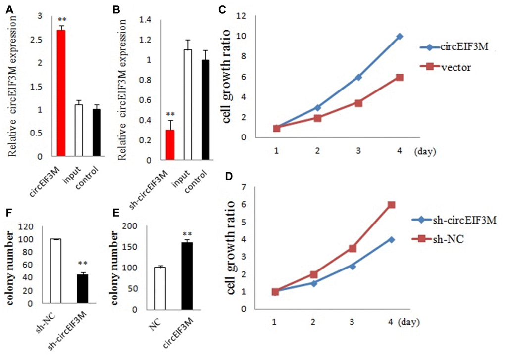 We detected the expression of circEIF3M and its parental gene EIF3M in the transfected cells. The circEIF3M was overexpressed and knocked down in MDA-MB-231 cells respectively. The expression of circEIF3M was significantly different from that of the control group (Figure 4A and 4B). However, there was no difference in the expression of EIF3M (Supplementary Figure 5), suggesting that the expression of circEIF3M did not activate or inhibit the expression level of EIF3M. To study the biological function of circEIF3M in TNBC cells, CCK8 assays were carried out to show that upregulation of circEIF3M significantly increased the proliferation capacity of MDA-MB-231 cells, while downregulation of circEIF3M inhibited cell growth (Figure 4C and 4D). Colony formation assays further confirmed that upregulation of circEIF3M can increase the proliferation of MDA-MB-231 cells, while downregulation of circEIF3M can significantly suppress the proliferation of MDA-MB-231 cells (Figure 4E and 4F). These results indicated that circEIF3M promotes proliferation of TNBC cells.