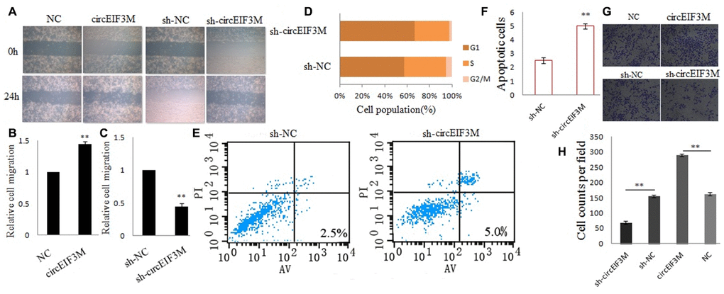 Transwell and wound healing assays were performed to explore the roles of circEIF3M in TNBC cells. The results suggested that up-regulation of circEIF3M significantly promoted the invasion and migration capacities of MDA-MB-231cells, whereas down-regulation of circEIF3M markedly inhibited the invasion and migration capacities of MDA-MB-231cells (Figure 5A–5C; 5G, 5H). In addition, to evaluate whether circEIF3M has an effect on cell cycle progression and apoptosis of TNBC cells, cell cycle analysis was carried out and the data revealed that downregulation of circEIF3M led to G1 arrest of TNBC cells (Figure 5D). Flow cytometry analysis further demonstrated that compared with the sh-NC control group, the apoptotic rate of MDA-MB-231 cells transfected with sh-circ was higher (Figure 5E, 5F). These data indicated that circEIF3M enhanced the progression of TNBC cells.