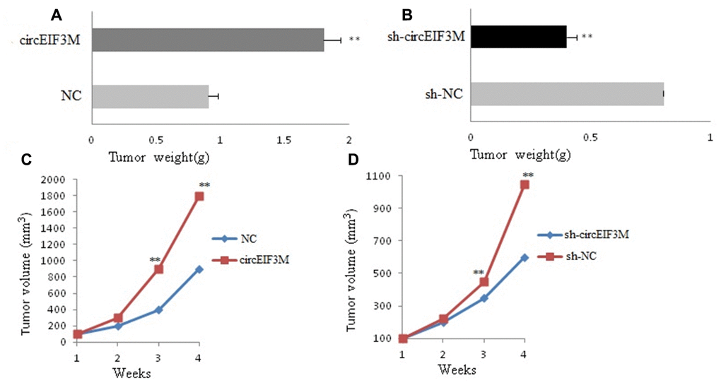 All animal experiments were approved by Nanjing Medical University Institutional Animal Care and Use Committee. Twenty-four female nude mice were randomly divided into four groups: circEIF3M, sh-circEIF3M, control-NC and control-sh-NC (n=6 each group). Briefly, for xenograft experiments, 1 × 107 MDA-MB-231 cells were injected subcutaneously into the mammary fat pads of nude mice. There were six mice per group. Tumor size was monitored once per week. The formula for calculating the volume of tumors was 0.5×length×width2. The mice were sacrificed after 4 weeks and tumors tissues were removed for further analysis.