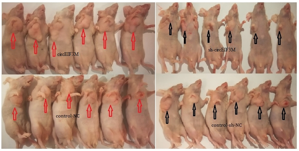 In order to study the effects of circEIF3M on tumor growth in vivo, MDA-MB-231 cells were stably transfected with over expression or vector control and infected with sh-NC or sh-circ and then subcutaneously injected into nude mice. The results of animal experiments showed that compared with the control group, the tumors derived from cells overexpressing circEIF3M were bigger and heavier. Conversely, compared with the sh-NC control group, the tumors derived from cells infected with sh-circ had smaller sizes and lower weights (Figure 6A–6D; Figure 7). Taken together, the data confirmed the oncogenic role of circ EIF3M in TNBC.