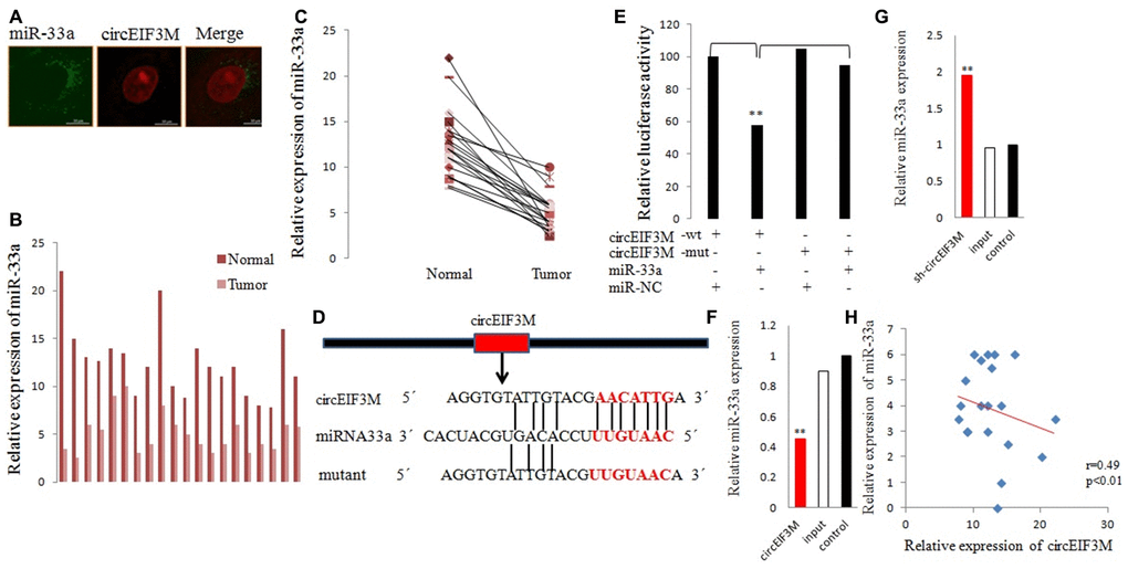 To comprehend the molecular function of circEIF3M, we predicted the potential targets of circEIF3M by miRNA target prediction software (TargetScan database). We investigated the ability of chr11:32589546:32596047:+ binding miRNAs. MiRNA mimics of the 10 miRNAs that potentially interacted with chr11:32589546:32596047:+ were synthesized and cotransfected with psiCHECK2-circ, respectively. We mutated each miRNA target site from psiCHECK2-circ expressing vector, denoted psiCHECK2-circ-M. MiR-33a mimics cotransfected with psiCHECK2-circ had a reduced the luciferase reporter activities, compared with those cotransfected with psiCHECK2-circ-M (Supplementary Figure 6). The other 9 miRNA mimics and negative control of mimics showed no effect on luciferase reporter activities of neither psiCHECK2-circ nor psiCHECK2-circ-M.