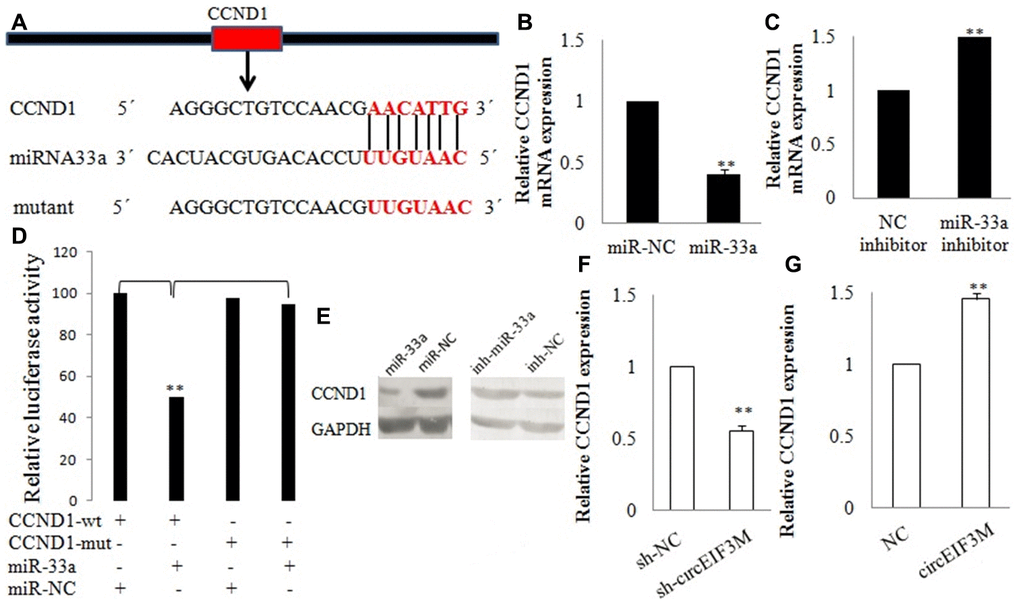 CCND1 and circEIF3M share the same MRE of miR-33a according to target prediction software -TargetScan (Figure 9A). MiR-33a mimics significantly decreased the expression of CCND1, while miR-33a inhibitors significantly increased the expression of CCND1 in MDA-MB-231 cells (Figure 9B, 9C). A dual luciferase reporter assay was conducted to evaluate this prediction, and the data suggested that miR-33a mimics could suppress the activity of the luciferase reporter gene with CCND1 3’UTR-WT compared to the mutant group (Figure 9D). In addition, the protein expression level of CCND1 also changed correspondingly in TNBC cells (Figure 9E). As expected, knockdown of circEIF3M significantly inhibited the expressions of CCND1, while overexpression of circEIF3M greatly activated the expression level of CCND1 (Figure 9F–9G). In summary, these data show that circEIF3M could activate CCND1 expression through serving as a ceRNA for miR-33a (Figure 10).