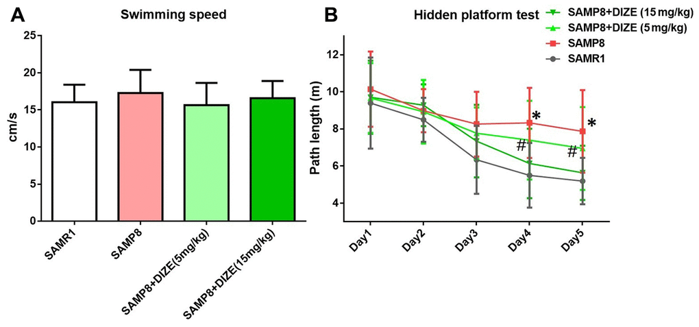 Morris water maze (MWM) test was performed during the last 5 days before mice were killed. First, we compared the swimming speed between SAMP8 mice and their age-matched SAMR1 control mice, but no difference was noted (Figure 6A). DIZE injection did not significantly affect swimming speed in SAMP8 mice (5 mg/kg and 15 mg/kg, Figure 6B) or their age-matched SAMR1 control mice (15 mg/kg, data not shown). Afterwards, we employed a hidden platform test to assess the spatial cognitive functions in SAMP8 mice and their age-matched SAMR1 control mice. SAMP8 mice swam more distance than their age-matched SAMR1 control mice to find the hidden platform from day 4 to day 5 (day 4: 8.325±1.891 vs. 5.497±1.739 m; day 5: 7.869±2.226 vs. 5.188±1.25 m; n=12 per group, P<0.05). Two-way repeated measures ANOVA indicated that SAMP8 mice performed worse than their age-matched SAMR1 control mice during the whole task (Fgenotype (1, 110)=27.82, P<0.05), confirming that SAMP8 mice displayed evident spatial cognitive impairment at 9 months of age. As indicated by Figure 6B, DIZE injection (15 mg/kg) rescued this spatial cognitive impairment in SAMP8 mice (Ftreatment (1, 110)=11.41, P<0.05). DIZE injection (15 mg/kg) had no impact on spatial cognitive impairment in SAMR1 control mice (data not shown).