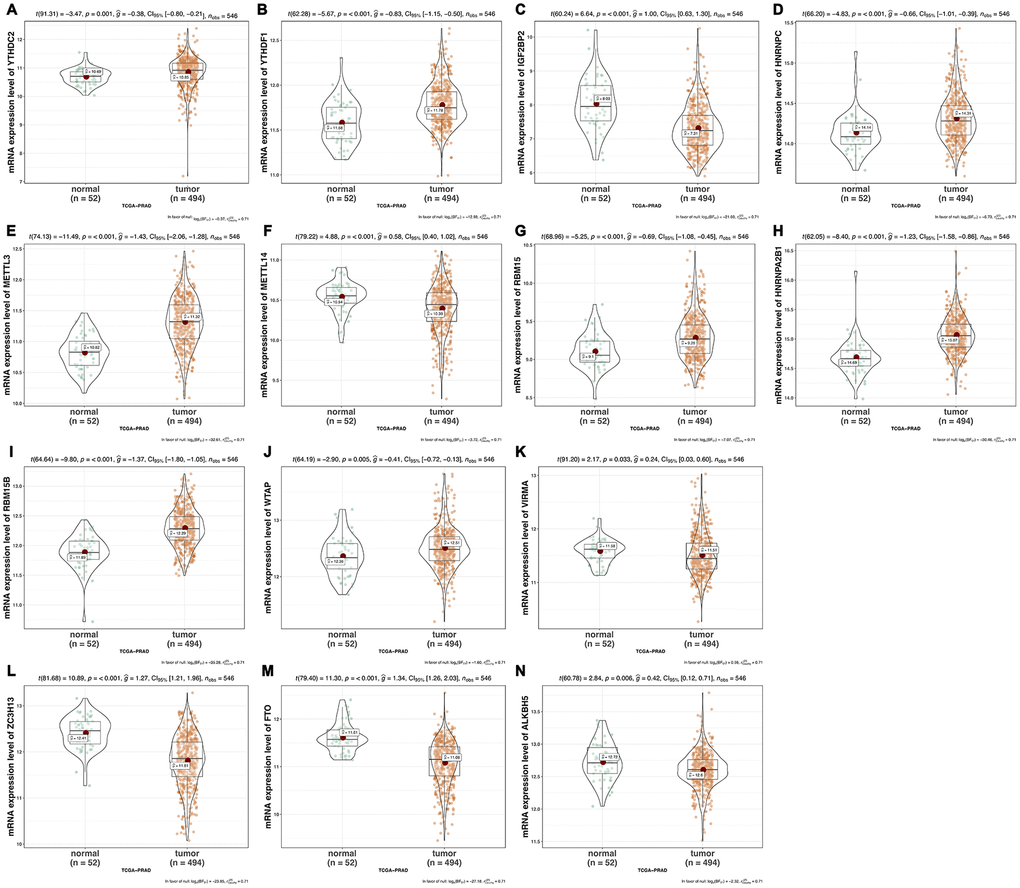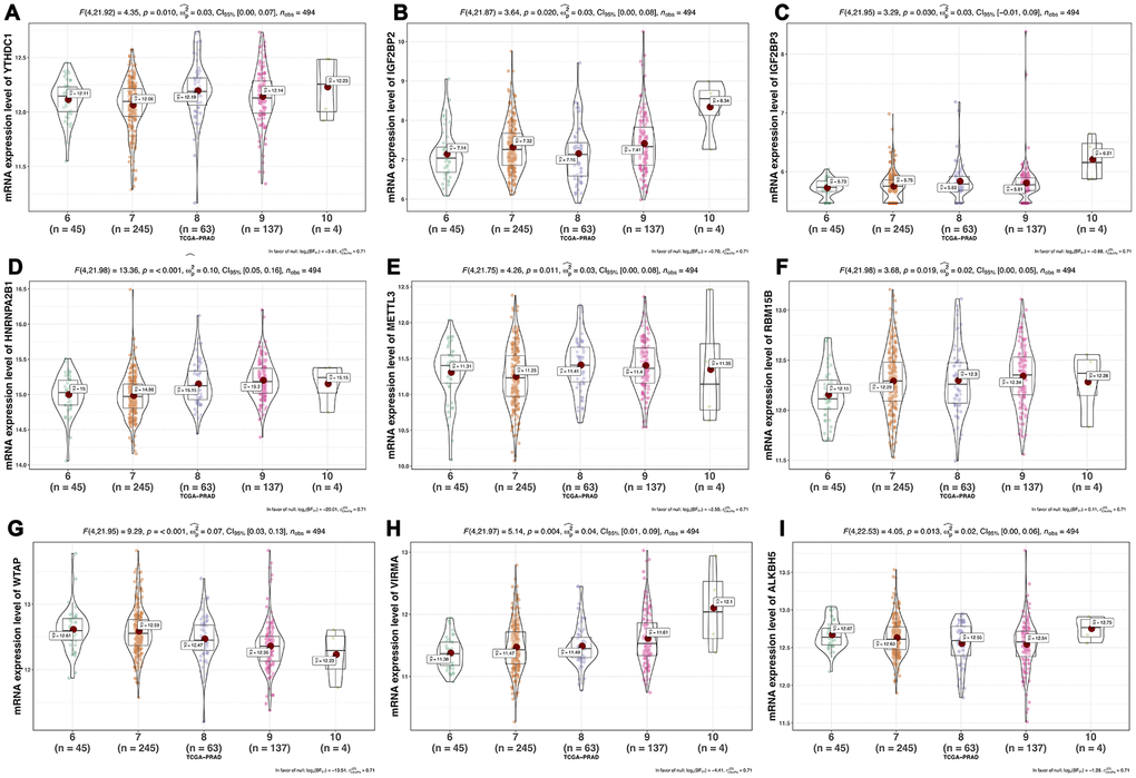 Standard student t-test and one-way analysis of variance (ANOVA) were used to compare the mRNA expression level of m6A methylation regulators in different clinical subgroups and CNV phenotypes in prostate adenocarcinoma. Chi-square tests were carried out to compare the distribution of age, Gleason Score, T and N stage in “with m6A regulators mutation and/or CNV” and “without m6A regulators mutation and CNV” group.